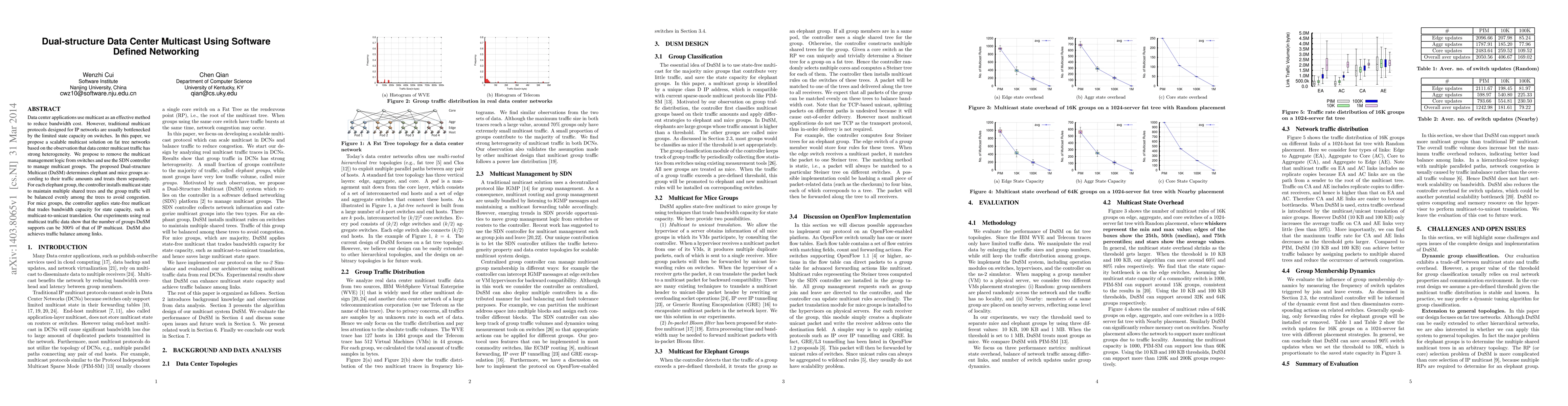 Data center applications use multicast as an effective method to reduce bandwidth cost. However, traditional multicast protocols designed for IP networks are usually bottlenecked by the limited state capacity on switches. In this paper, we propose a scalable multicast solution on fat tree networks based on the observation that data center multicast traffic has strong heterogeneity. We propose to remove the multicast management logic from switches and use the SDN controller to manage multicast groups. The proposed Dual-structure Multicast (DuSM) determines elephant and mice groups according to their traffic amounts and treats them separately. For each elephant group, the controller installs multicast state to maintain multiple shared trees and the group traffic will be balanced evenly among the trees to avoid congestion. For mice groups, the controller applies state-free mutlicast that trades bandwidth capacity for state capacity, such as multicast-to-unicast translation. Our experiments using real multicast traffic data show that the number of groups DuSM supports can be 300% of that of IP multicast. DuSM also achieves traffic balance among links.