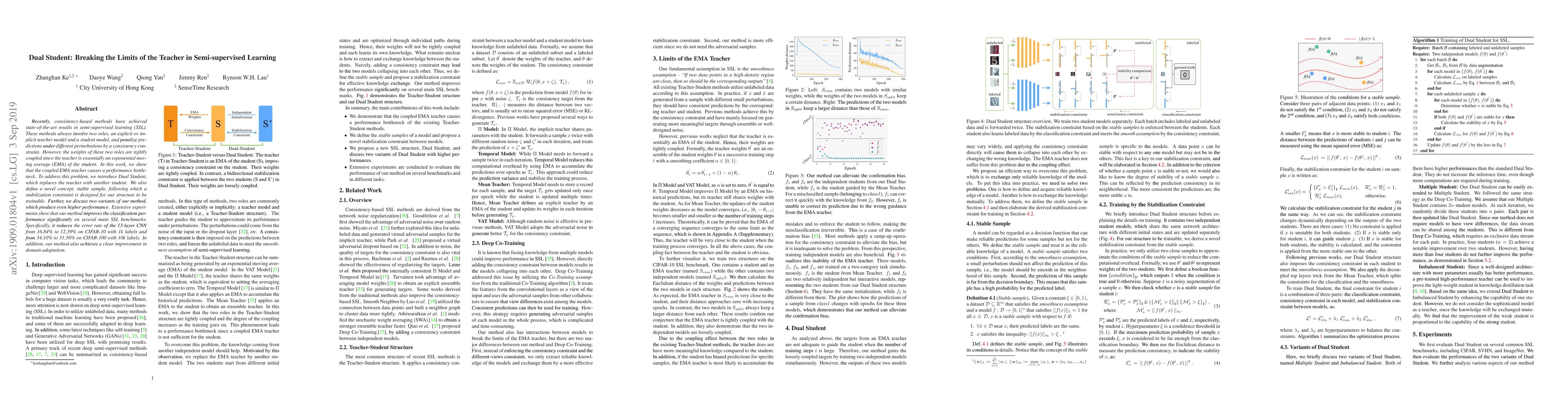 This paper introduces Dual Student, a novel approach to semi-supervised learning that replaces the traditional teacher model with another student model, aiming to break the performance bottleneck caused by the tightly coupled exponential moving average (EMA) teacher. The method employs a stabilization constraint based on stable samples and demonstrates significant improvements in classification performance and domain adaptation across several benchmarks.