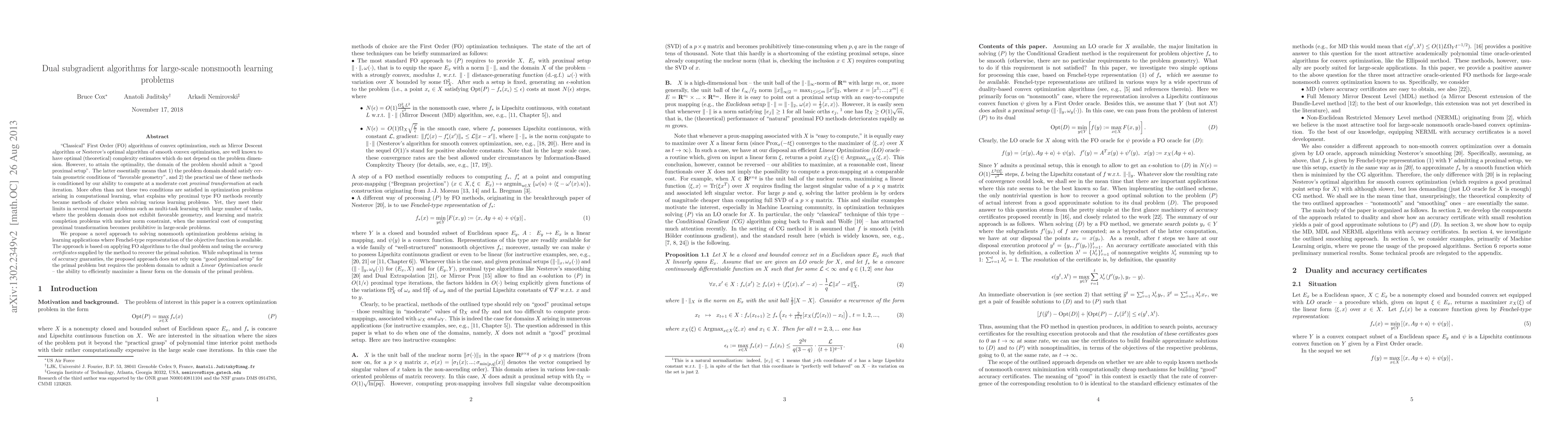 This paper proposes dual subgradient algorithms for large-scale nonsmooth learning problems where classical proximal first-order methods fail due to unfavorable geometry or high computational costs. The approach leverages dual problem optimization and accuracy certificates to recover primal solutions without requiring a "good proximal setup."