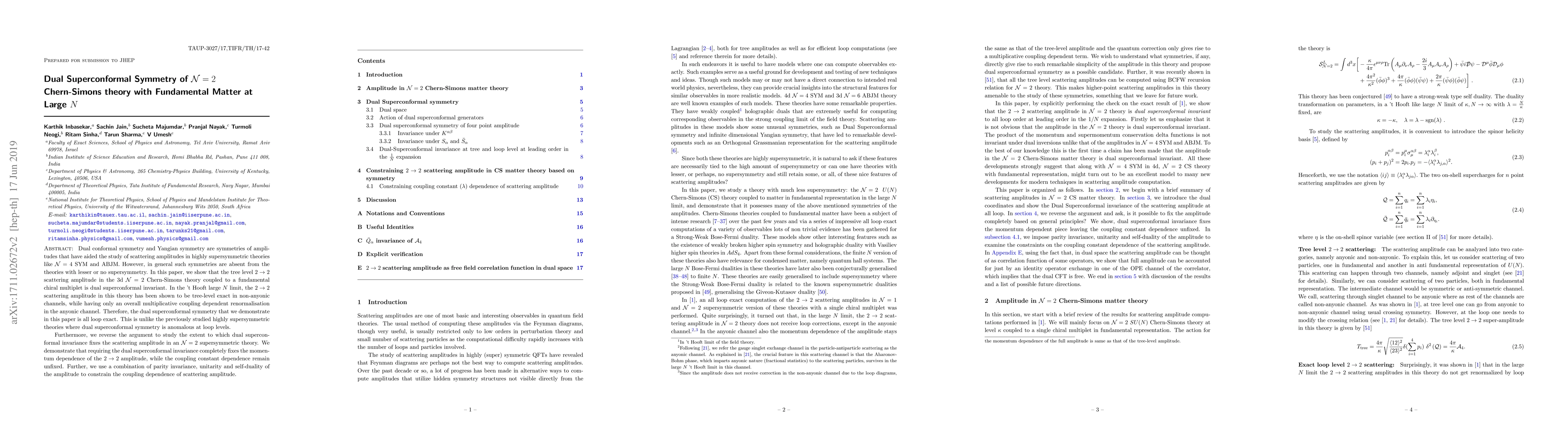 Dual conformal symmetry and Yangian symmetry are symmetries of amplitudes that have aided the study of scattering amplitudes in highly supersymmetric theories like ${\cal N}=4$ SYM and ABJM. However, in general such symmetries are absent from the theories with lesser or no supersymmetry. In this paper, we show that the tree level $2\to 2$ scattering amplitude in the 3d ${\cal N}=2$ Chern-Simons theory coupled to a fundamental chiral multiplet is dual superconformal invariant. In the 't Hooft large $N$ limit, the $2\to 2$ scattering amplitude in this theory has been shown to be tree-level exact in non-anyonic channels, while having only an overall multiplicative coupling dependent renormalisation in the anyonic channel. Therefore, the dual superconformal symmetry that we demonstrate in this paper is all loop exact. This is unlike the previously studied highly supersymmetric theories where dual superconformal symmetry is anomalous at loop levels. Furthermore, we reverse the argument to study the extent to which dual superconformal invariance fixes the scattering amplitude in an ${\cal N}=2$ supersymmetric theory. We demonstrate that requiring the dual superconformal invariance completely fixes the momentum dependence of the $2\to2$ amplitude, while the coupling constant dependence remain unfixed. Further, we use a combination of parity invariance, unitarity and self-duality of the amplitude to constrain the coupling dependence of scattering amplitude.