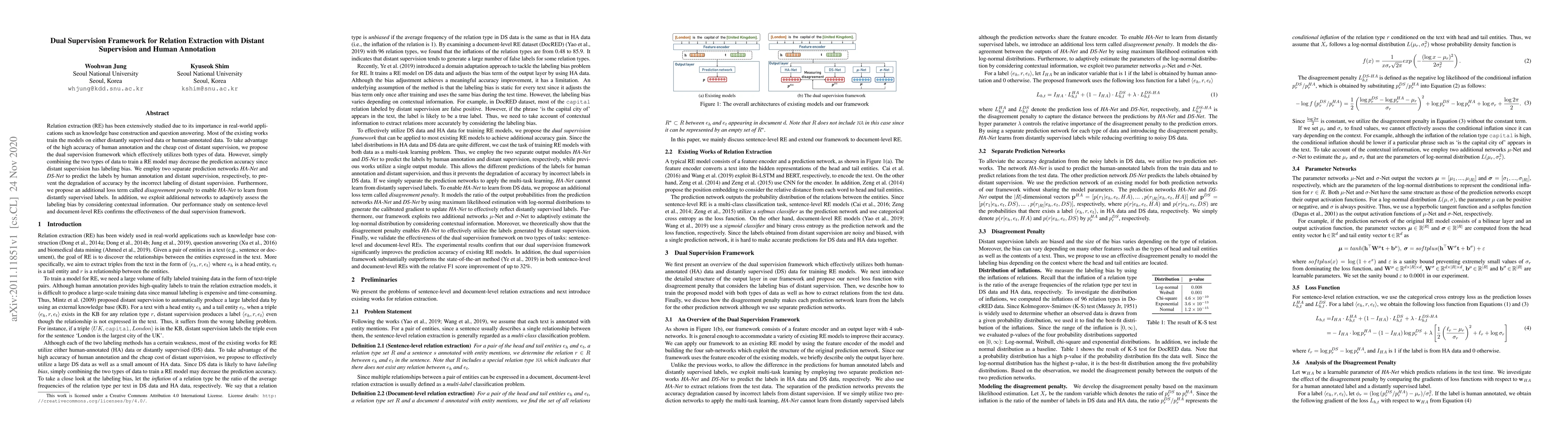 This research introduces a dual supervision framework for relation extraction, combining human-annotated data for high accuracy and distant supervision for cost efficiency, while employing separate networks and a disagreement penalty to mitigate labeling bias and improve prediction accuracy. The framework's effectiveness is demonstrated through performance studies on both sentence-level and document-level relation extraction tasks.