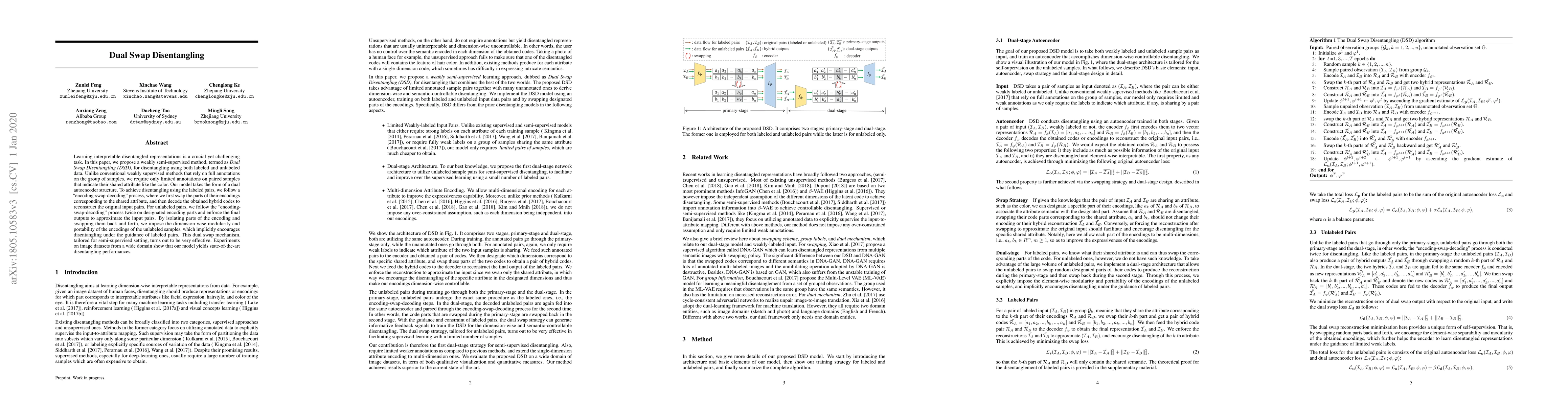 The paper introduces Dual Swap Disentangling (DSD), a weakly semi-supervised method for learning interpretable disentangled representations using both labeled and unlabeled data. The method employs a dual autoencoder structure and a "encoding-swap-decoding" process to achieve disentangling, showing state-of-the-art performance on image datasets.