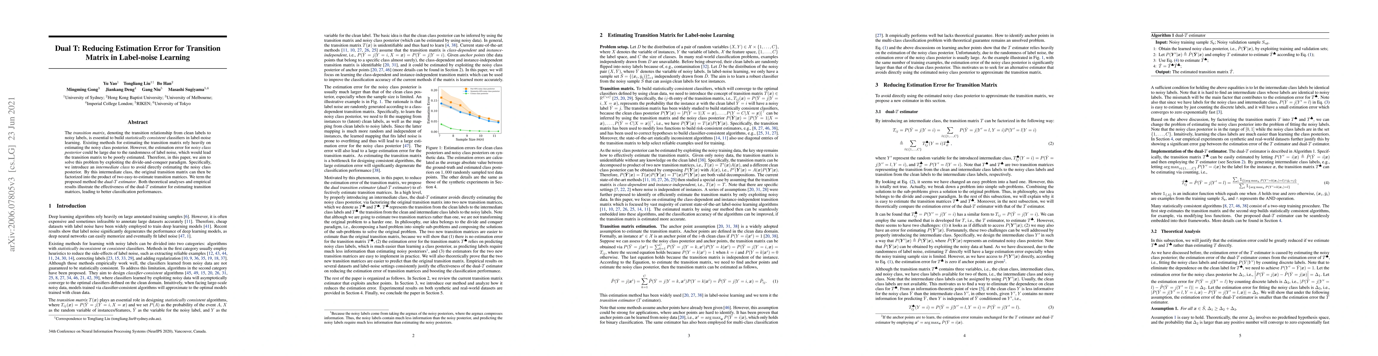 A new method called dual-T is proposed to reduce estimation error for transition matrices in label-noise learning, leading to better classification performances through theoretical analysis and empirical results.