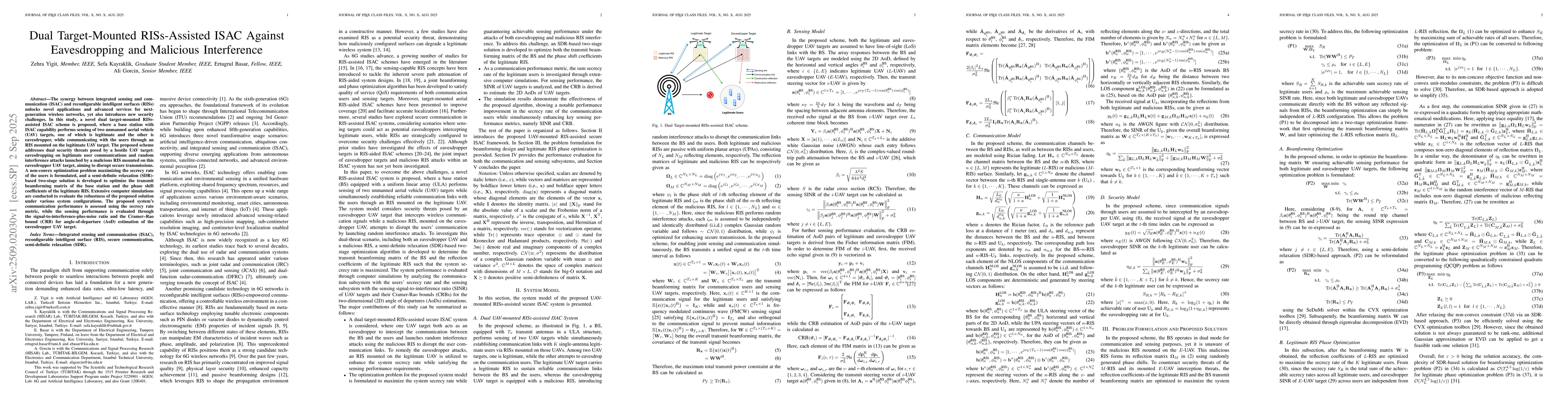 The synergy between integrated sensing and communication (ISAC) and reconfigurable intelligent surfaces (RISs) unlocks novel applications and advanced services for next-generation wireless networks, yet also introduces new security challenges. In this study, a novel dual target-mounted RISs-assisted ISAC scheme is proposed, where a base station with ISAC capability performs sensing of two unmanned aerial vehicle (UAV) targets, one of which is legitimate and the other is eavesdropper, while communicating with the users through an RIS mounted on the legitimate UAV target. The proposed scheme addresses dual security threats posed by a hostile UAV target: eavesdropping on legitimate user communications and random interference attacks launched by a malicious RIS mounted on this eavesdropper UAV target, aiming to disrupt secure transmissions. A non-convex optimization problem maximizing the secrecy rate of the users is formulated, and a semi-definite relaxation (SDR)-based two-stage solution is developed to optimize the transmit beamforming matrix of the base station and the phase shift coefficients of the legitimate RIS. Extensive computer simulations are conducted to evaluate the robustness of the proposed solution under various system configurations. The proposed system's communication performance is assessed using the secrecy rate metric, while the sensing performance is evaluated through the signal-to-interference-plus-noise ratio and the Cramer-Rao bound (CRB) for angle-of-departure (AoD) estimation of the eavesdropper UAV target.