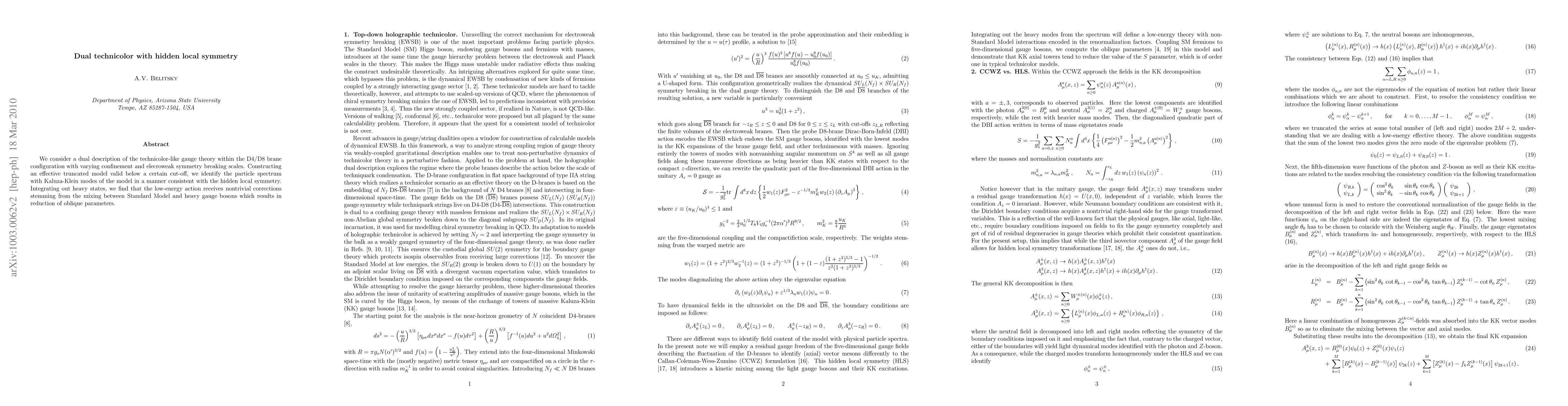 We consider a dual description of the technicolor-like gauge theory within the D4/D8 brane configuration with varying confinement and elecroweak symmetry breaking scales. Constructing an effective truncated model valid below a certain cut-off, we identify the particle spectrum with Kaluza-Klein modes of the model in a manner consistent with the hidden local symmetry. Integrating out heavy states, we find that the low-energy action receives nontrivial corrections stemming from the mixing between Standard Model and heavy gauge bosons which results in reduction of oblique parameters.