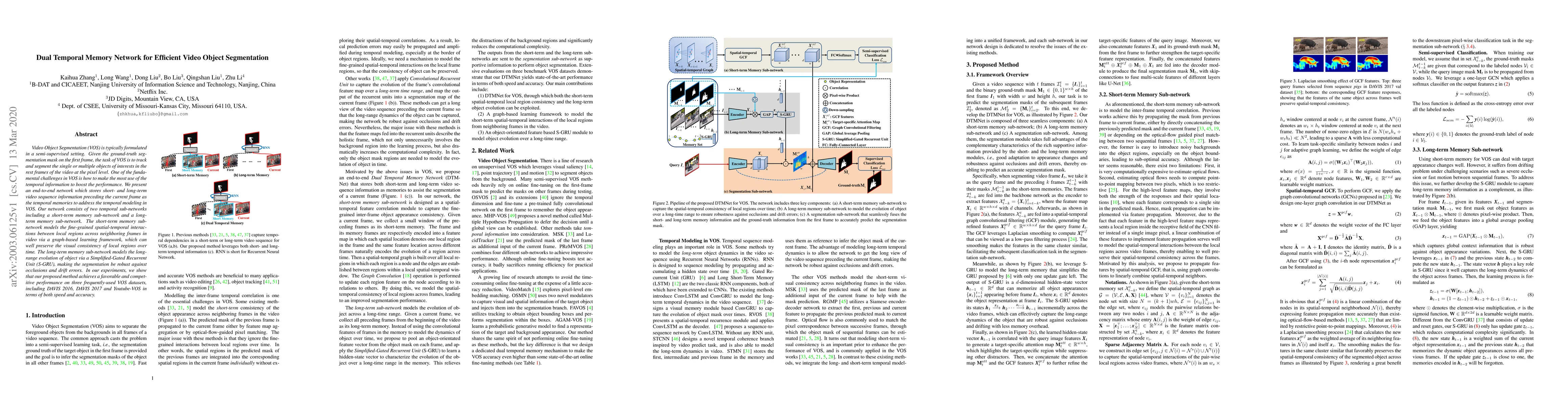 This paper proposes a dual temporal memory network for efficient video object segmentation, utilizing short-term and long-term memory sub-networks to model spatial-temporal interactions and long-range object evolution, respectively. The method achieves competitive performance on several VOS datasets in terms of both speed and accuracy.