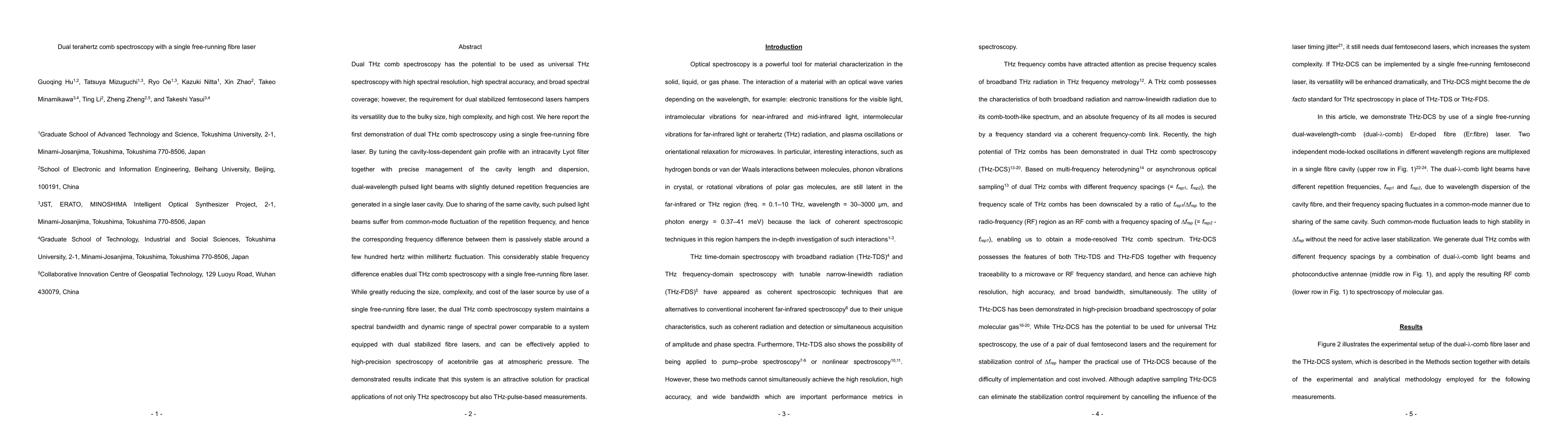 This work is novel as it is the first to demonstrate dual THz comb spectroscopy using a single free-running fibre laser, significantly reducing the size, complexity, and cost of the laser source while maintaining high-performance THz spectroscopy.