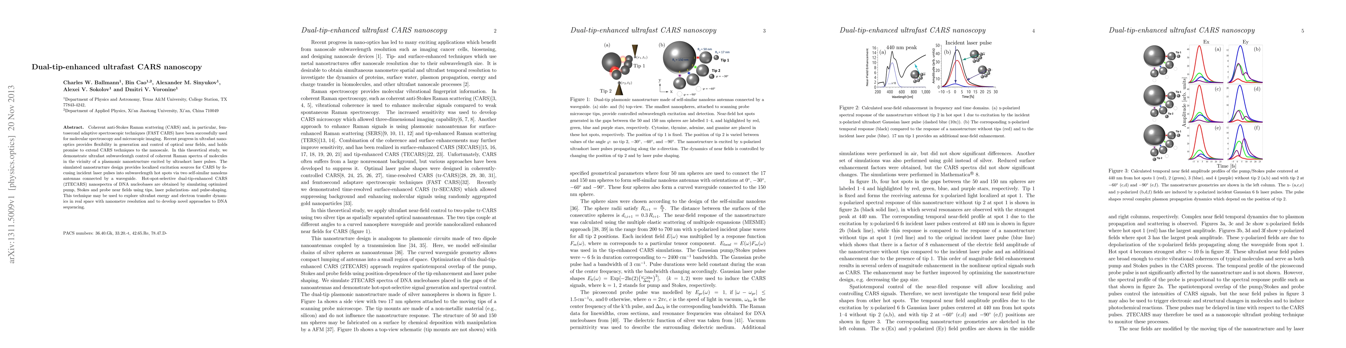 This theoretical study demonstrates the use of dual-tip-enhanced CARS nanoscopy to achieve subwavelength control of coherent Raman spectra near plasmonic nanostructures. The technique employs two self-similar nanolens antennas to focus laser pulses into nanoscale hot spots, enabling high-resolution imaging and potential applications in studying ultrafast energy transfer in DNA.