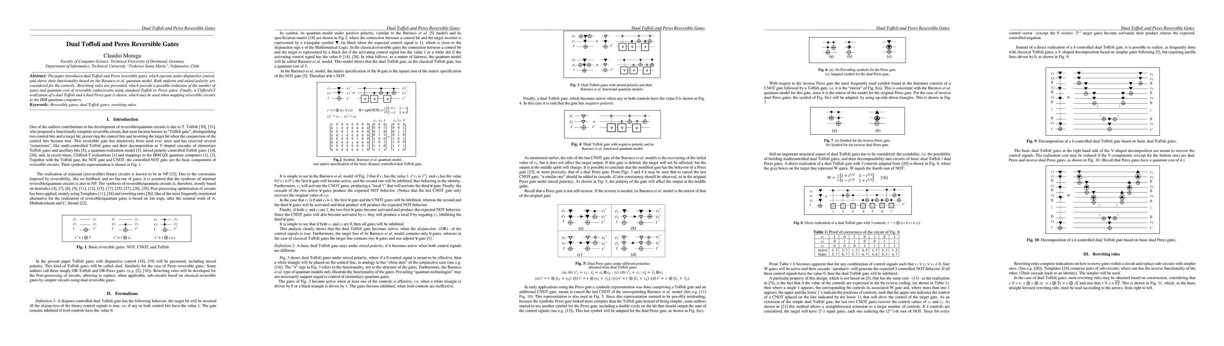 The paper proposes dual Toffoli and Peres reversible gates operating under disjunctive control within the Barenco et al. quantum model, presenting rewriting rules to reduce gate count and quantum cost. It also demonstrates a Clifford+T realization for practical implementation on IBM quantum computers.