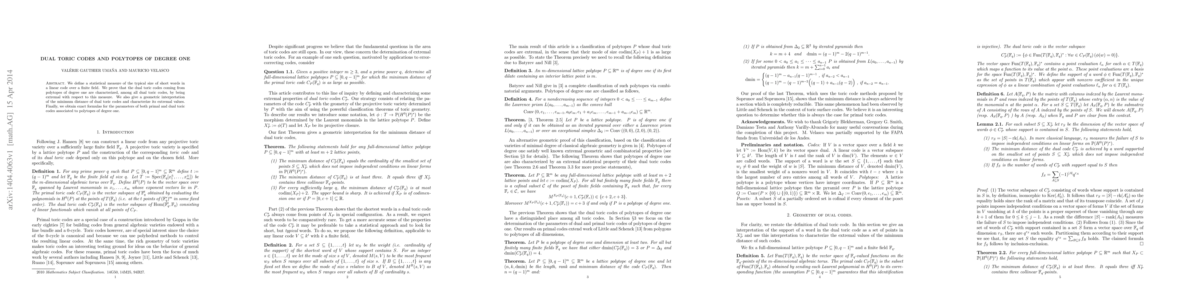 We define a statistical measure of the typical size of short words in a linear code over a finite field. We prove that the dual toric codes coming from polytopes of degree one are characterized, among all dual toric codes, by being extremal with respect to this measure. We also give a geometric interpretation of the minimum distance of dual toric codes and characterize its extremal values. Finally, we obtain formulas for the parameters of both primal and dual toric codes associated to polytopes of degree one.