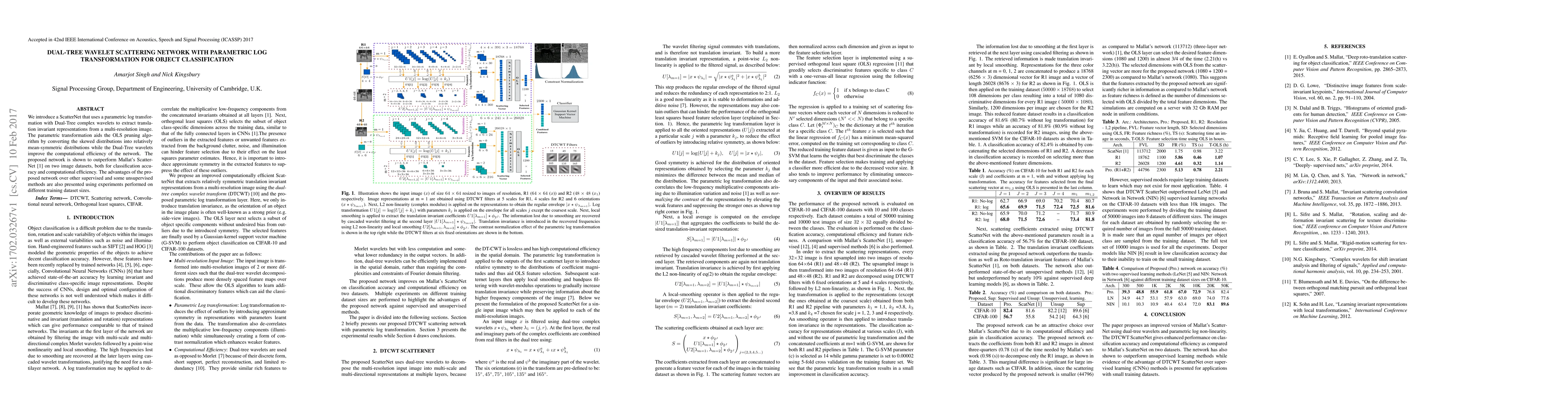 This paper proposes a ScatterNet using Dual-Tree wavelet scattering with a parametric log transformation to extract translation-invariant image representations. The network outperforms traditional methods in classification accuracy and computational efficiency on two image datasets.