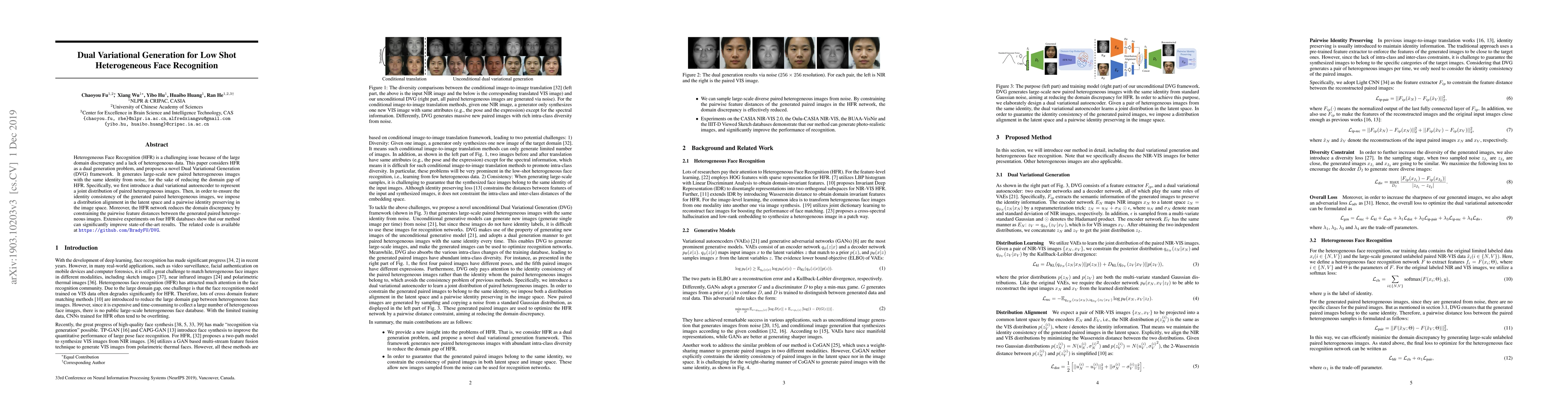 This paper proposes a Dual Variational Generation (DVG) framework to tackle the challenge of Heterogeneous Face Recognition (HFR) by generating paired heterogeneous images to reduce domain discrepancy. The method uses a dual variational autoencoder and imposes distribution alignment and identity preservation to ensure generated images maintain the same identity, significantly improving HFR performance.