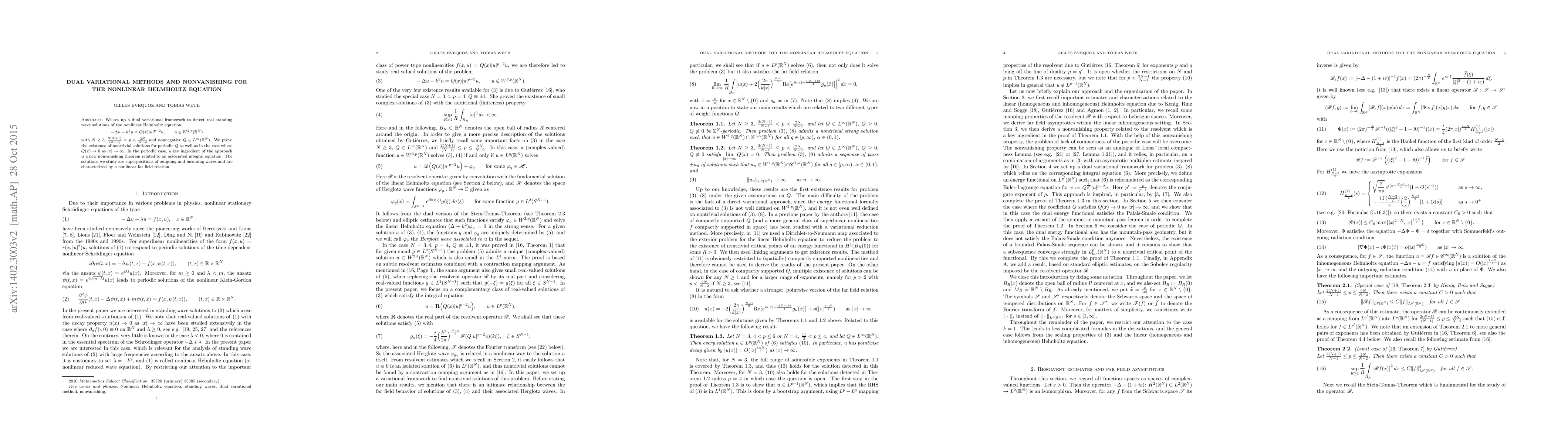 This paper establishes a dual variational framework to find real standing wave solutions for the nonlinear Helmholtz equation, proving the existence of nontrivial solutions under periodic and decaying conditions on the potential $Q$. A new nonvanishing theorem is crucial for the periodic case, and solutions exhibit a nonlinear far field relation.