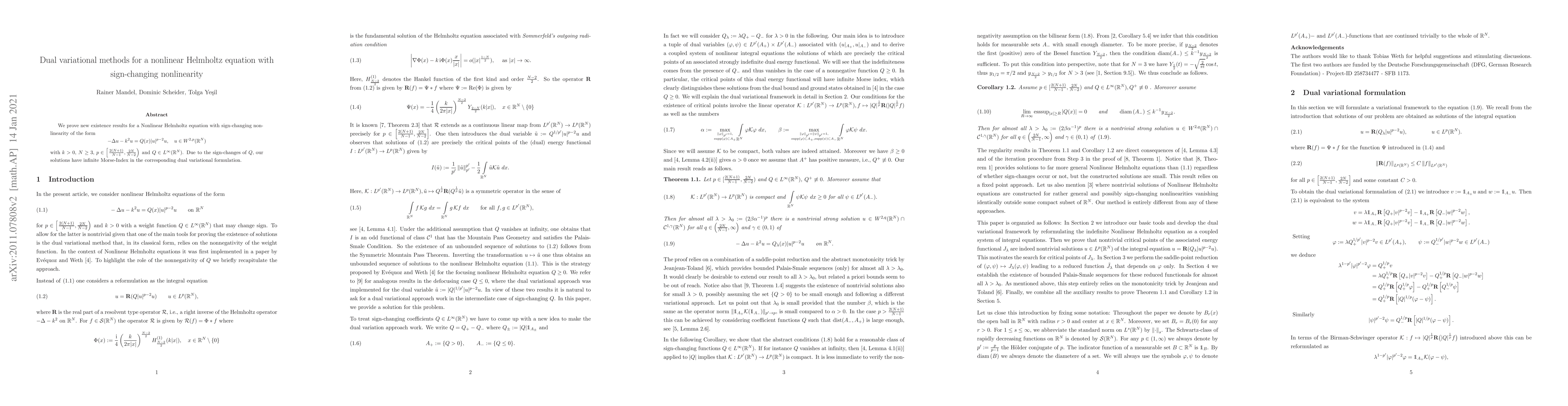 This paper proves new existence results for a nonlinear Helmholtz equation featuring sign-changing nonlinearity. Utilizing dual variational methods, it demonstrates solutions with infinite Morse-Index due to the sign-changing nature of the function Q.