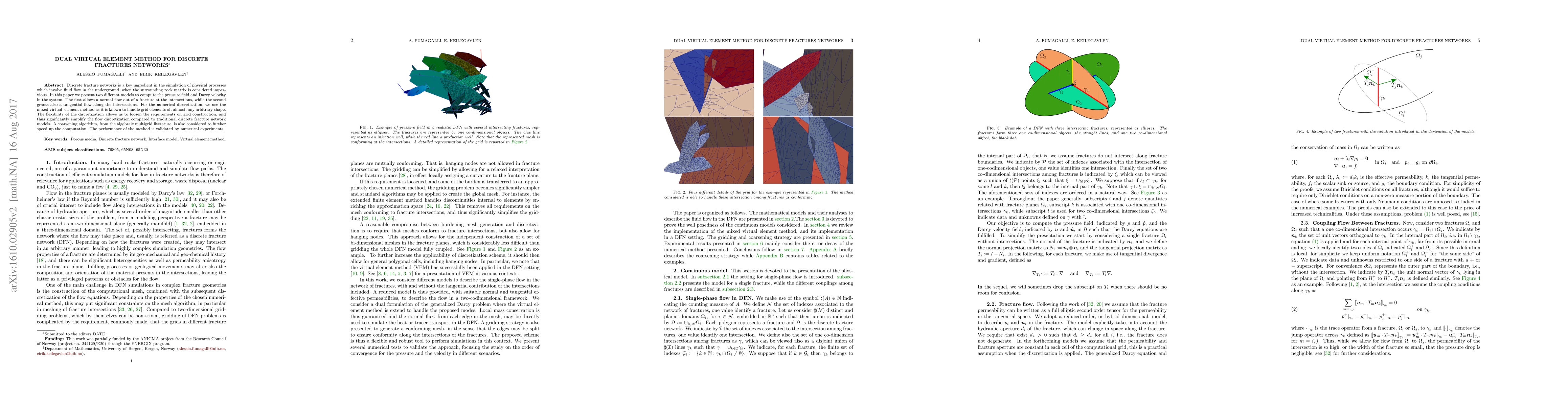 Discrete fracture networks is a key ingredient in the simulation of physical processes which involve fluid flow in the underground, when the surrounding rock matrix is considered impervious. In this paper we present two different models to compute the pressure field and Darcy velocity in the system. The first allows a normal flow out of a fracture at the intersections, while the second grants also a tangential flow along the intersections. For the numerical discretization, we use the mixed virtual finite element method as it is known to handle grid elements of, almost, any arbitrary shape. The flexibility of the discretization allows us to loosen the requirements on grid construction, and thus significantly simplify the flow discretization compared to traditional discrete fracture network models. A coarsening algorithm, from the algebraic multigrid literature, is also considered to further speed up the computation. The performance of the method is validated by numerical experiments.