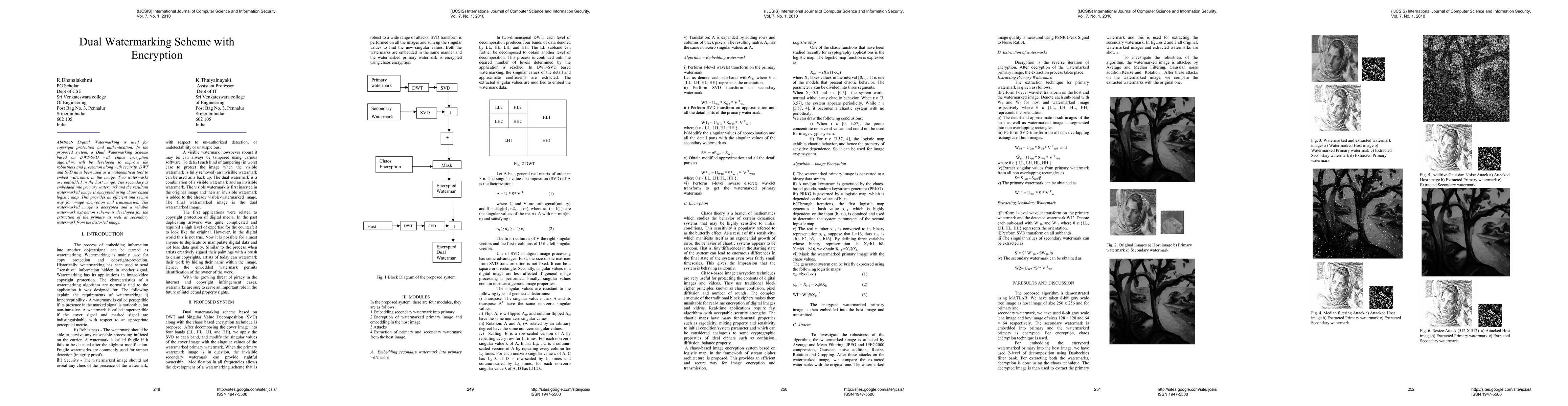 Digital Watermarking is used for copyright protection and authentication. In the proposed system, a Dual Watermarking Scheme based on DWT SVD with chaos encryption algorithm, will be developed to improve the robustness and protection along with security. DWT and SVD have been used as a mathematical tool to embed watermark in the image. Two watermarks are embedded in the host image. The secondary is embedded into primary watermark and the resultant watermarked image is encrypted using chaos based logistic map. This provides an efficient and secure way for image encryption and transmission. The watermarked image is decrypted and a reliable watermark extraction scheme is developed for the extraction of the primary as well as secondary watermark from the distorted image.