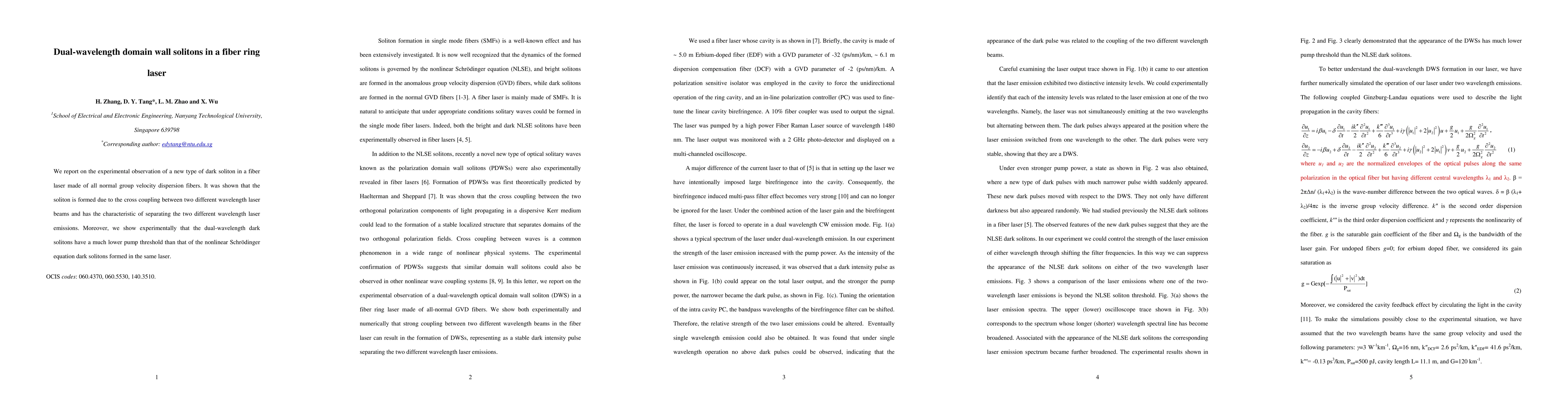 This paper reports on the experimental observation of dual-wavelength domain wall solitons in a fiber ring laser, formed through cross coupling between two different wavelength beams, which exhibit a lower pump threshold compared to traditional solitons.