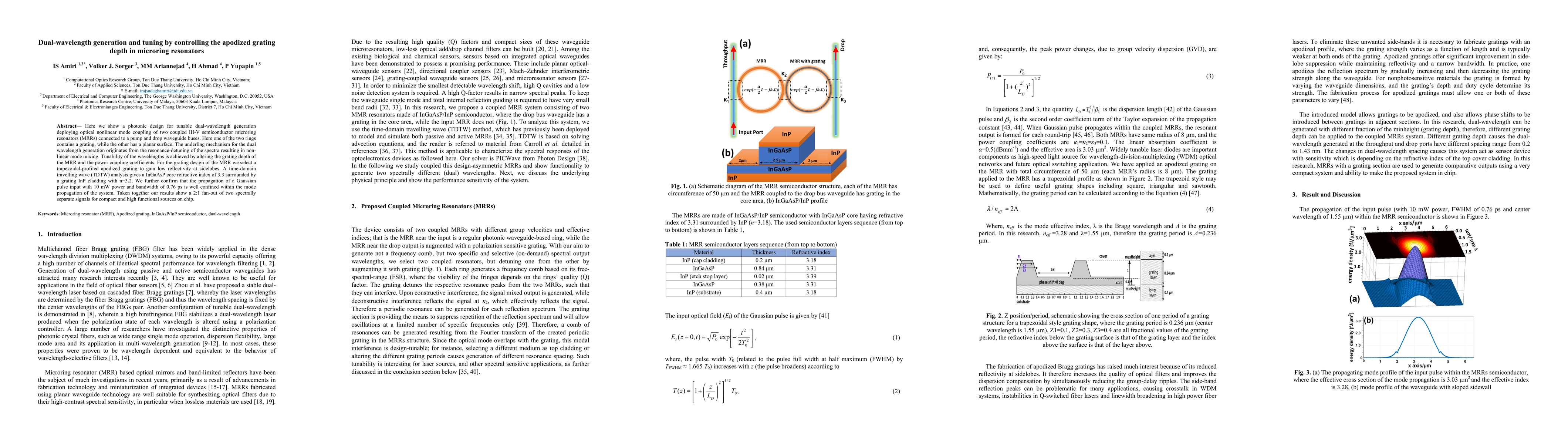 Here we show a photonic design for tunable dual-wavelength generation deploying optical nonlinear mode coupling of two coupled III-V semiconductor microring resonators (MRRs) connected to a pump and drop waveguide buses. Here one of the two rings contains a grating, while the other has a planar surface. The underling mechanism for the dual wavelength generation originates from the resonance-detuning of the spectra resulting in non-linear mode mixing. Tunability of the wavelengths is achieved by altering the grating depth of the MRR and the power coupling coefficients. For the grating design of the MRR we select a trapezoidal-profiled apodized grating to gain low reflectivity at sidelobes. A time-domain travelling wave (TDTW) analysis gives a InGaAsP core refractive index of 3.3 surrounded by a grating InP cladding with n=3.2. We further confirm that the propagation of a Gaussian pulse input with 10 mW power and bandwidth of 0.76 ps is well confined within the mode propagation of the system. Taken together our results show a 2:1 fan-out of two spectrally separate signals for compact and high functional sources on chip.