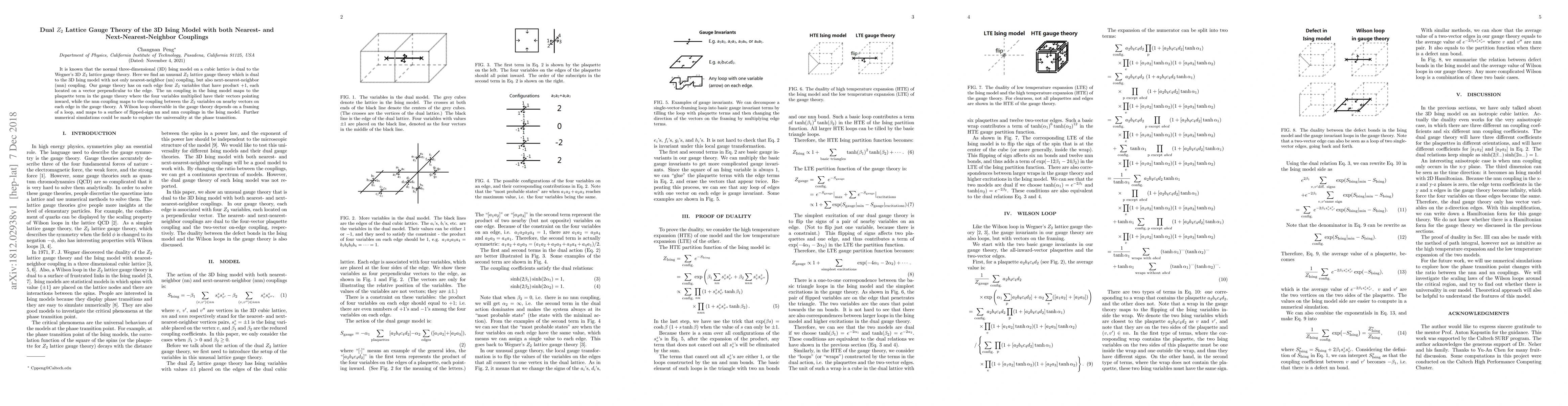 This paper presents a dual $Z_2$ lattice gauge theory corresponding to the 3D Ising model with both nearest-neighbor and next-nearest-neighbor couplings. The gauge theory includes four $Z_2$ variables per edge, mapping Ising couplings to gauge interactions and Wilson loops.