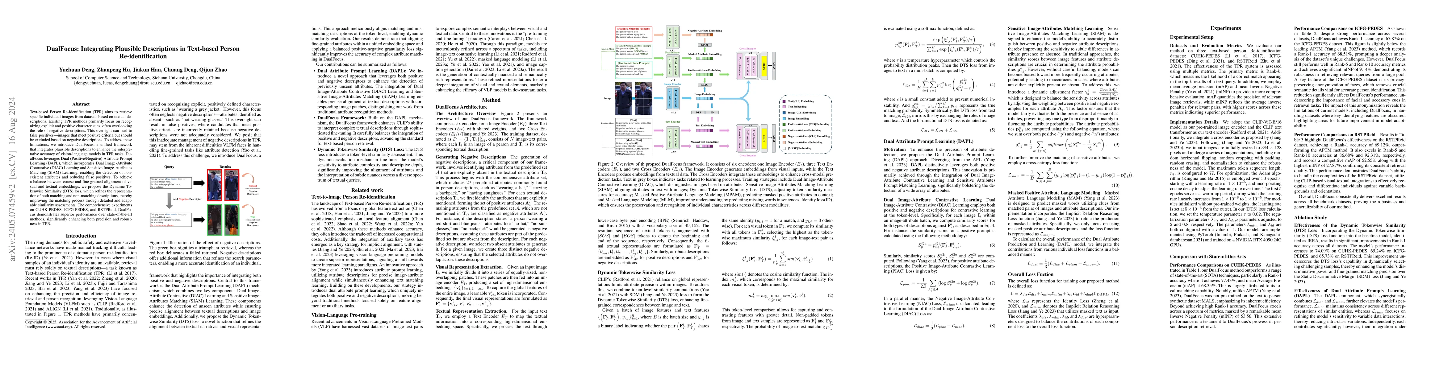 DualFocus introduces a framework integrating positive and negative descriptors for improved text-based person retrieval, employing DAPL with DIAC and SIAM learning to enhance precision and reduce false positives. The DTS loss further balances coarse and fine-grained alignments, significantly outperforming existing methods in precision and robustness on multiple datasets.