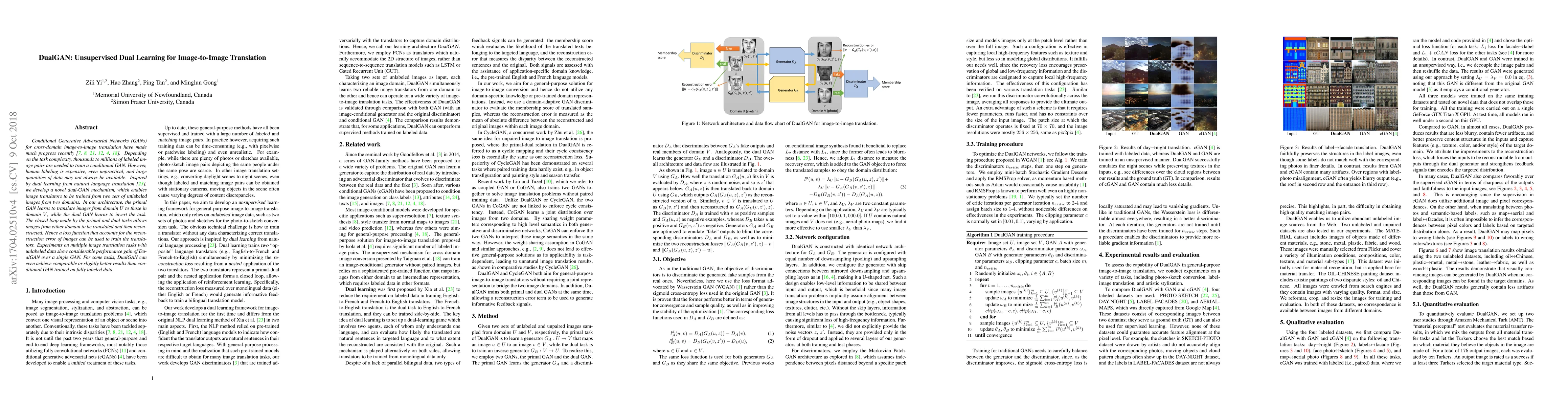 Conditional Generative Adversarial Networks (GANs) for cross-domain image-to-image translation have made much progress recently. Depending on the task complexity, thousands to millions of labeled image pairs are needed to train a conditional GAN. However, human labeling is expensive, even impractical, and large quantities of data may not always be available. Inspired by dual learning from natural language translation, we develop a novel dual-GAN mechanism, which enables image translators to be trained from two sets of unlabeled images from two domains. In our architecture, the primal GAN learns to translate images from domain U to those in domain V, while the dual GAN learns to invert the task. The closed loop made by the primal and dual tasks allows images from either domain to be translated and then reconstructed. Hence a loss function that accounts for the reconstruction error of images can be used to train the translators. Experiments on multiple image translation tasks with unlabeled data show considerable performance gain of DualGAN over a single GAN. For some tasks, DualGAN can even achieve comparable or slightly better results than conditional GAN trained on fully labeled data.
