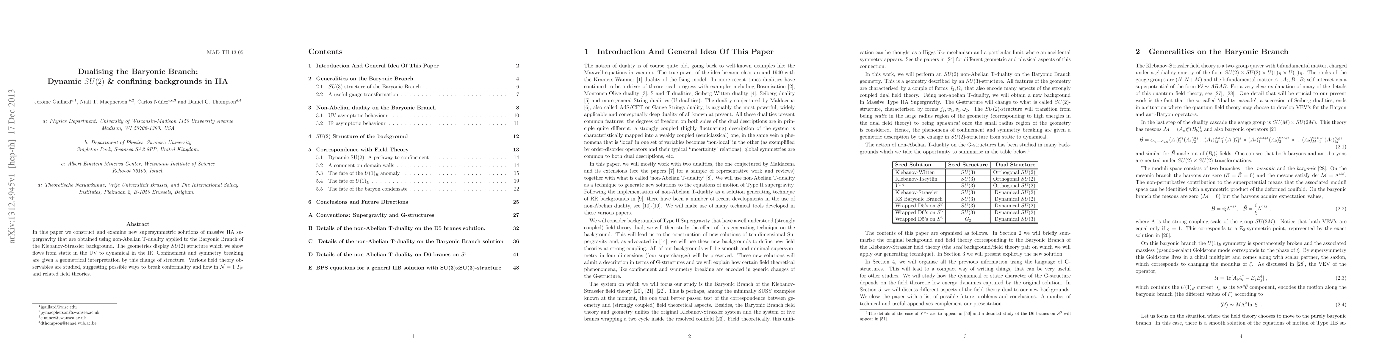 This paper constructs new supersymmetric solutions in massive IIA supergravity using non-Abelian T-duality on the Baryonic Branch of the Klebanov-Strassler background, revealing an SU(2) structure transitioning from static to dynamic. It provides a geometrical interpretation of confinement and symmetry breaking, and explores field theory implications for breaking conformality in $N=1$ $T_N$ theories.