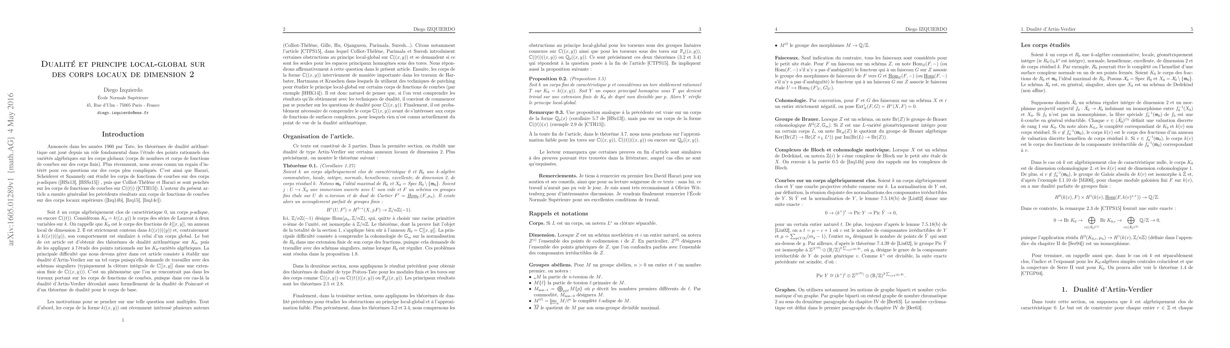 Let $k$ be an algebraically closed field, a finite field or a $p$-adic field. Let $K_0=k((x,y))$ be the field of Laurent series in two variables over $k$. We define Tate-Shafarevich groups of a commutative group scheme over $K_0$ via cohomology classes locally trivial at each completion of $K_0$ coming from a codimension 1 point of $\text{Spec}\; k[[x,y]]$. We establish duality theorems between Tate-Shafarevich groups for finite groups schemes and for tori. We apply these results to the study of the obstruction to the local-global principle for $K_0$-torsors under a connected linear algebraic group, answering in that way a question of Colliot-Th\'el\`ene, Parimala and Suresh, and to the weak approximation for tori over $K_0$. Soit $k$ un corps alg\'ebriquement clos, un corps fini, ou encore un corps $p$-adique. Soit $K_0=k((x,y))$ le corps des s\'eries de Laurent \`a deux variables sur $k$. On d\'efinit les groupes de Tate-Shafarevich d'un $K_0$-sch\'ema en groupes commutatif en consid\'erant les classes de cohomologie qui deviennent triviales sur chaque compl\'et\'e de $K_0$ provenant d'un point codimension 1 de $\text{Spec}\; k[[x,y]]$. On \'etablit des th\'eor\`emes de dualit\'e arithm\'etique entre des groupes de Tate-Shafarevich pour les modules finis et pour les tores. On applique ces r\'esultats \`a l'\'etude du principe local-global pour les $K_0$-torseurs sous un groupe lin\'eaire connexe, r\'epondant ainsi \`a une question de Colliot-Th\'el\`ene, Parimala et Suresh, ainsi qu'\`a l'approximation faible pour les tores sur $K_0$.