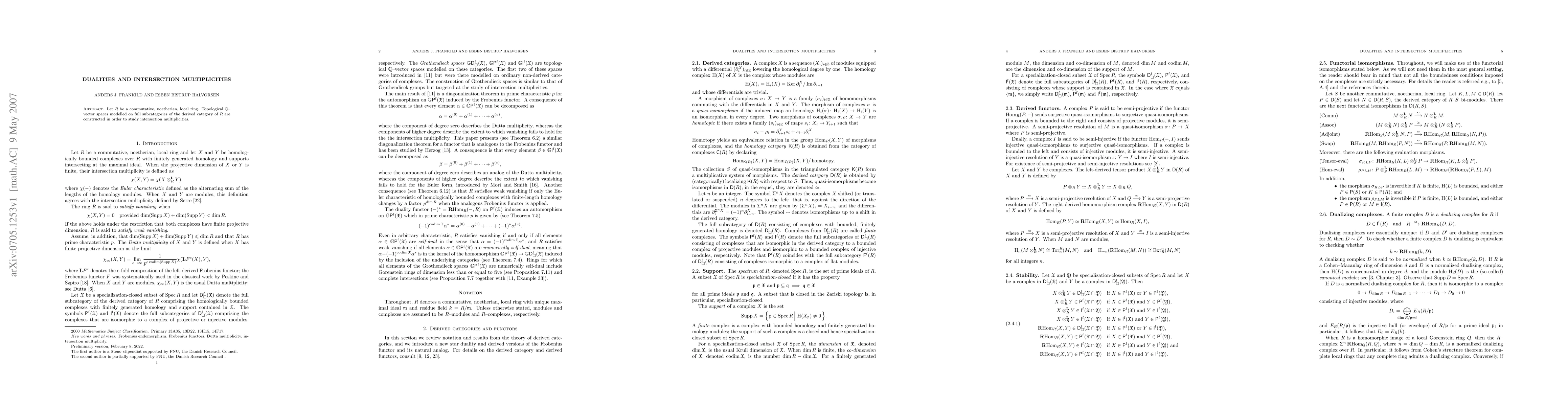 This paper constructs topological Q-vector spaces based on full subcategories of the derived category of a commutative, noetherian, local ring R to explore intersection multiplicities. The study delves into dualities and their implications for understanding these multiplicities.