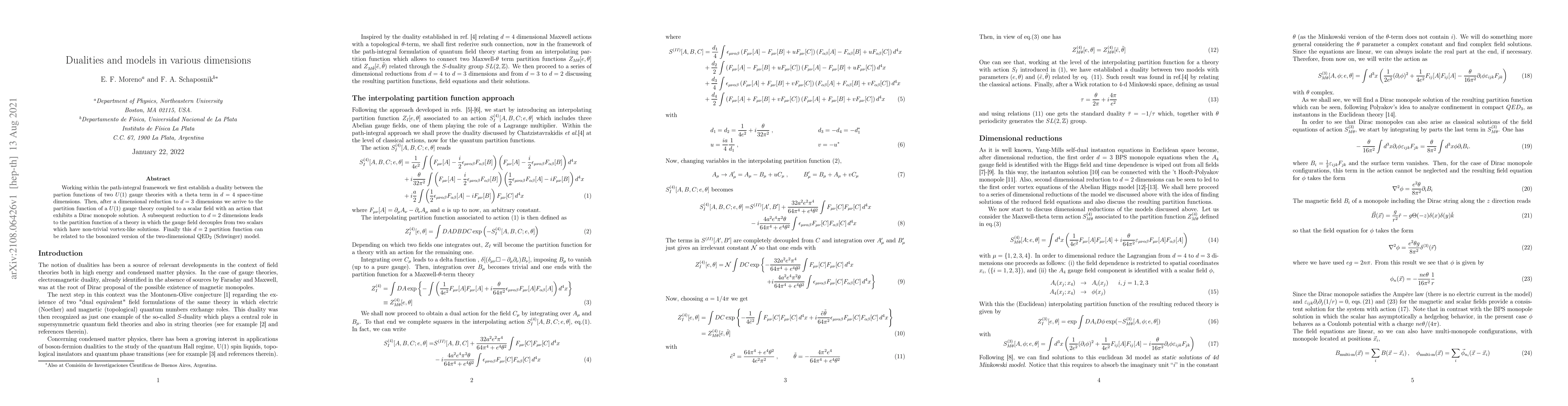 Working within the path-integral framework we first establish a duality between the partion functions of two $U(1)$ gauge theories with a theta term in $d=4$ space-time dimensions. Then, after a dimensional reduction to $d=3$ dimensions we arrive to the partition function of a $U(1)$ gauge theory coupled to a scalar field with an action that exhibits a Dirac monopole solution. A subsequent reduction to $d=2$ dimensions leads to the partition function of a theory in which the gauge field decouples from two scalars which have non-trivial vortex-like solutions. Finally this $d=2$ partition function can be related to the bosonized version of the two-dimensional QED$_2$ (Schwinger) model.