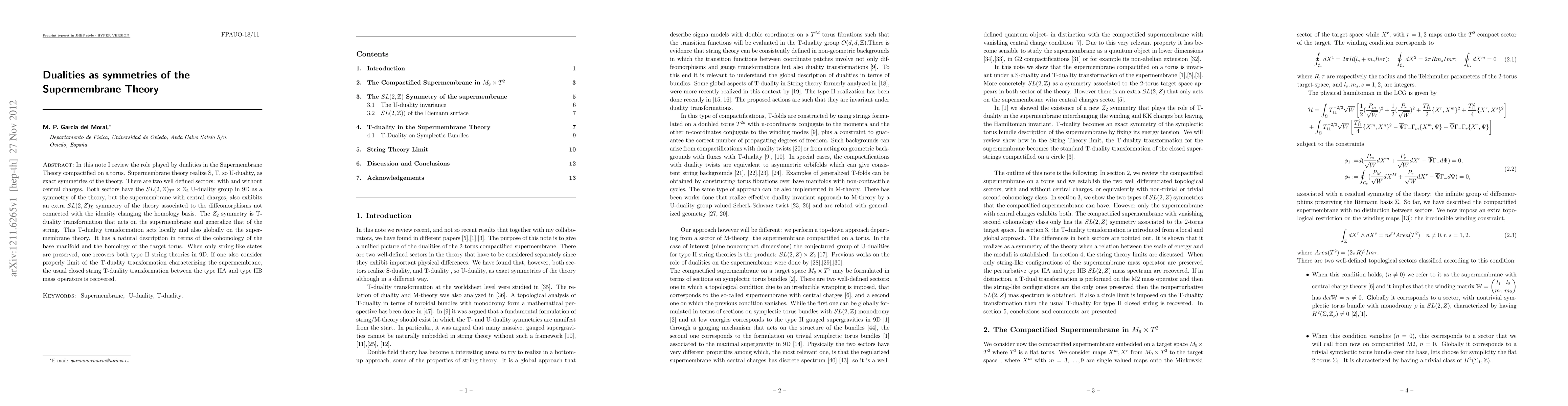 This paper reviews the symmetries of the Supermembrane Theory, highlighting the roles of S, T, and U-dualities. It reveals that the theory exhibits exact symmetries through SL(2,Z)×Z2 U-duality and an additional SL(2,Z) symmetry for configurations with central charges. The T-duality transformation, akin to that in string theory, acts both locally and globally, connecting to the cohomology and homology of the involved manifolds.