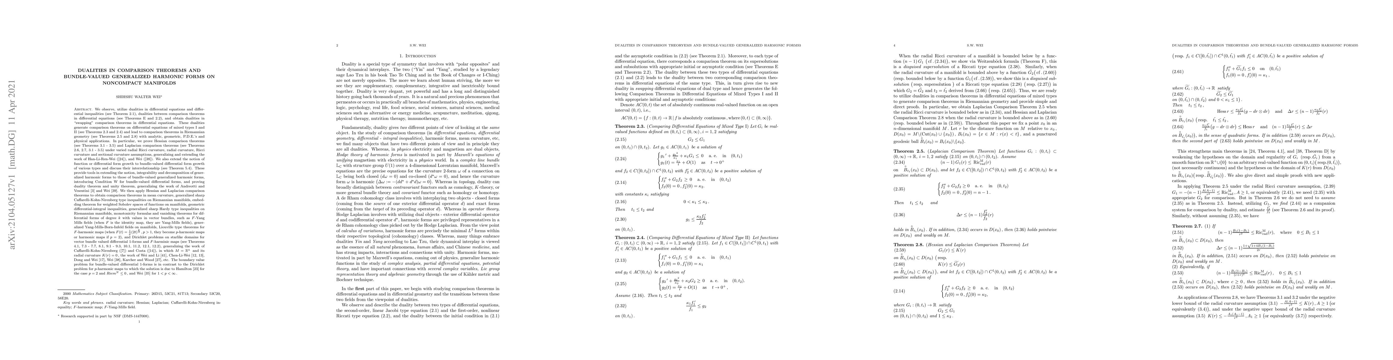 We observe, utilize dualities in differential equations and differential inequalities, dualities between comparison theorems in differential equations, and obtain dualities in "swapping" comparison theorems in differential equations. These dualities generate comparison theorems on differential equations of mixed types I and II and lead to comparison theorems in Riemannian geometry with analytic, geometric, P.D.E.'s and physical applications. In particular, we prove Hessian comparison theorems and Laplacian comparison theorem under varied radial Ricci curvature or radial curvature assumptions, generalizing and extending the work of Han-Li-Ren-Wei, and Wei. We also extend the notion of function or differential form growth to bundle-valued differential form growth of various types and discuss their interrelationship. These provide tools in extending the notion, integrability and decomposition of generalized harmonic forms to those of bundle-valued generalized harmonic forms, introducing Condition W for bundle-valued differential forms, and proving duality theorem and unity theorem, generalizing the work of Andreotti and Vesentini, and Wei. We then apply Hessian and Laplacian comparison theorems to obtain comparison theorems in mean curvature, generalized sharp Caffarelli-Kohn-Nirenberg type inequalities, embedding theorem for weighted Sobolev spaces, geometric differential-integral inequalities, generalized sharp Hardy type inequalities on Riemannian manifolds, monotonicity formulas and vanishing theorems for differential forms of degree $k$ with values in vector bundles, such as $F$-Yang Mills fields (when $F$ is the identity map, they are Yang-Mills fields), generalized Yang-Mills-Born-Infeld fields on manifolds, Liouville type theorems for $F$-harmonic maps, and Dirichlet problems on starlike domains for vector bundle valued differential $1$-forms and $F$-harminic maps, etc.