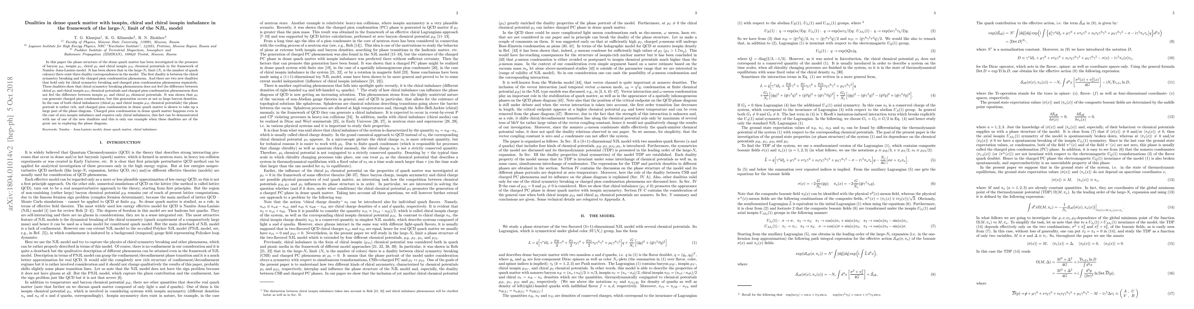 In this paper the phase structure of the dense quark matter has been investigated in the presence of baryon ${\mu}_B$, isospin ${\mu}_I$, chiral ${\mu}_{5}$ and chiral isospin ${\mu}_{I5}$ chemical potentials in the framework of Nambu--Jona-Lasinio model. It has been shown that in the large-$N_{c}$ limit ($N_{c}$ is the number of quark colours) there exist three duality correspondences in the model. The first duality is between the chiral symmetry breaking and the charged pion condensation phenomena. And there are two new dualities that hold only for chiral symmetry breaking and charged pion condensation phenomena separately. It was shown that at nonzero chiral ${\mu}_{5}$ chemical potential chiral isospin ${\mu}_{I5}$ chemical potential can generate charged pion condensation in dense quark matter even with zero ${\mu}_{I}$. But ${\mu}_{5}$ alone (in absence of ${\mu}_{I5}$ chemical potential) can generate this phase but not as powerfully as ${\mu}_{I5}$ does and only at comparatively low baryon densities.