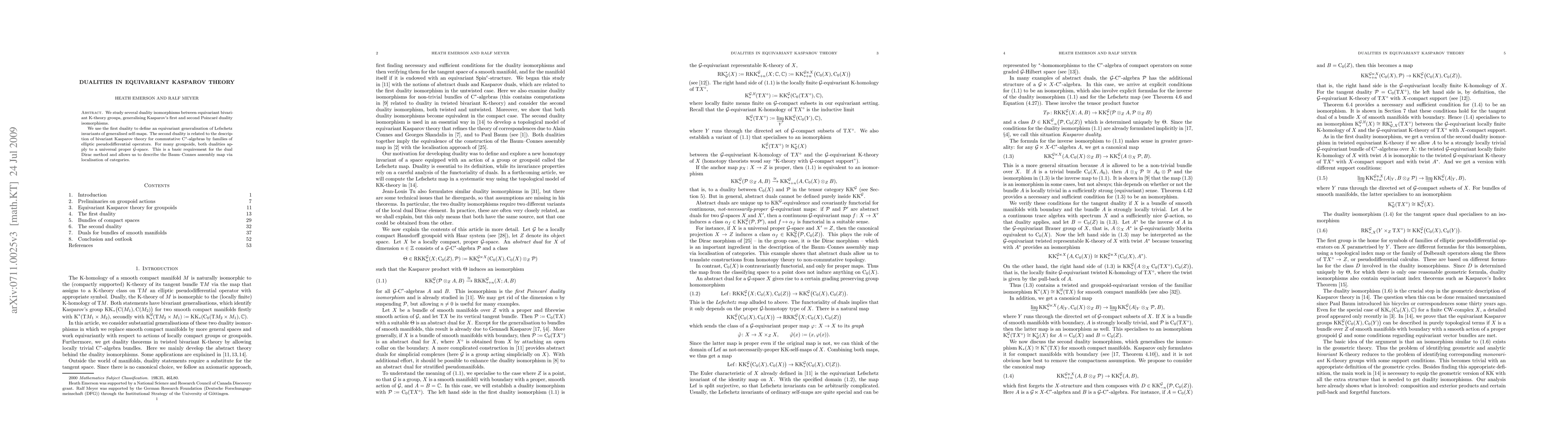 This paper explores duality isomorphisms in equivariant bivariant K-theory, generalizing Kasparov's Poincare dualities, and uses the first duality to define equivariant Lefschetz invariants. The second duality connects bivariant Kasparov theory for commutative C*-algebras to elliptic operators, and both dualities apply to universal proper G-spaces, facilitating the description of the Baum-Connes assembly map via localisation of categories.