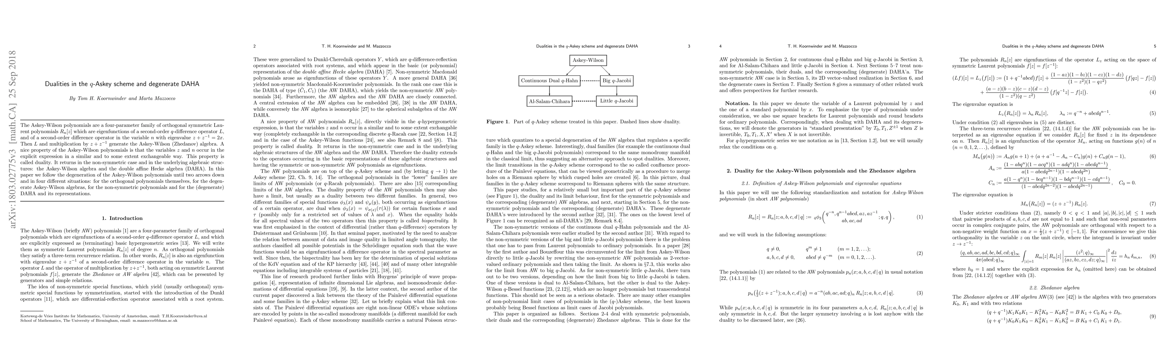 The Askey-Wilson polynomials are a four-parameter family of orthogonal symmetric Laurent polynomials $R_n[z]$ which are eigenfunctions of a second-order $q$-difference operator $L$, and of a second-order difference operator in the variable $n$ with eigenvalue $z +z^{-1}=2x$. Then $L$ and multiplication by $z+z^{-1}$ generate the Askey-Wilson (Zhedanov) algebra. A nice property of the Askey-Wilson polynomials is that the variables $z$ and $n$ occur in the explicit expression in a similar and to some extent exchangeable way. This property is called duality. It returns in the non-symmetric case and in the underlying algebraic structures: the Askey-Wilson algebra and the double affine Hecke algebra (DAHA). In this paper we follow the degeneration of the Askey-Wilson polynomials until two arrows down and in four different situations: for the orthogonal polynomials themselves, for the degenerate Askey-Wilson algebras, for the non-symmetric polynomials and for the (degenerate) DAHA and its representations.