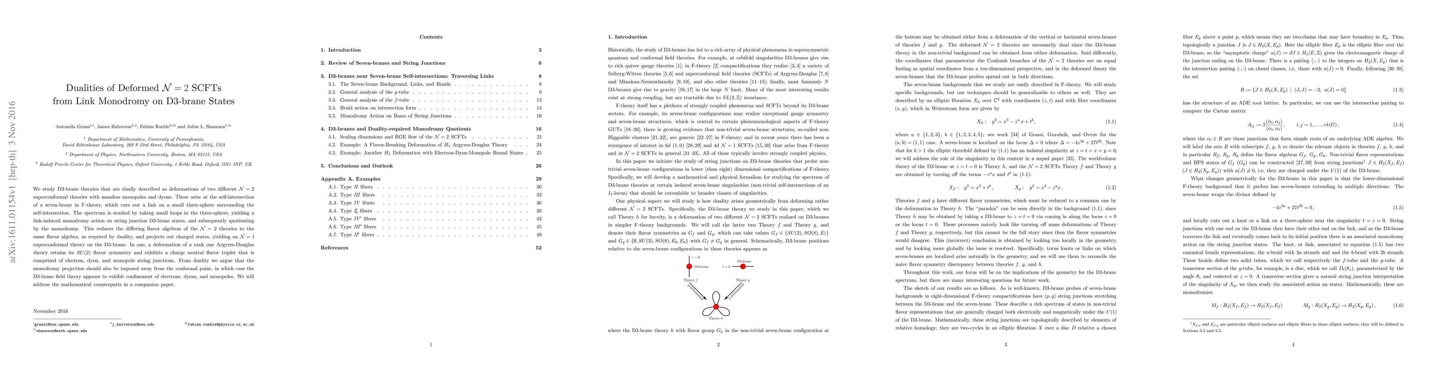 We study D3-brane theories that are dually described as deformations of two different $\mathcal{N}=2$ superconformal theories with massless monopoles and dyons. These arise at the self-intersection of a seven-brane in F-theory, which cuts out a link on a small three-sphere surrounding the self-intersection. The spectrum is studied by taking small loops in the three-sphere, yielding a link-induced monodromy action on string junction D3-brane states, and subsequently quotienting by the monodromy. This reduces the differing flavor algebras of the $\mathcal{N}=2$ theories to the same flavor algebra, as required by duality, and projects out charged states, yielding an $\mathcal{N}=1$ superconformal theory on the D3-brane. In one, a deformation of a rank one Argyres-Douglas theory retains its $SU(2)$ flavor symmetry and exhibits a charge neutral flavor triplet that is comprised of electron, dyon, and monopole string junctions. From duality we argue that the monodromy projection should also be imposed away from the conformal point, in which case the D3-brane field theory appears to exhibit confinement of electrons, dyons, and monopoles. We will address the mathematical counterparts in a companion paper.
