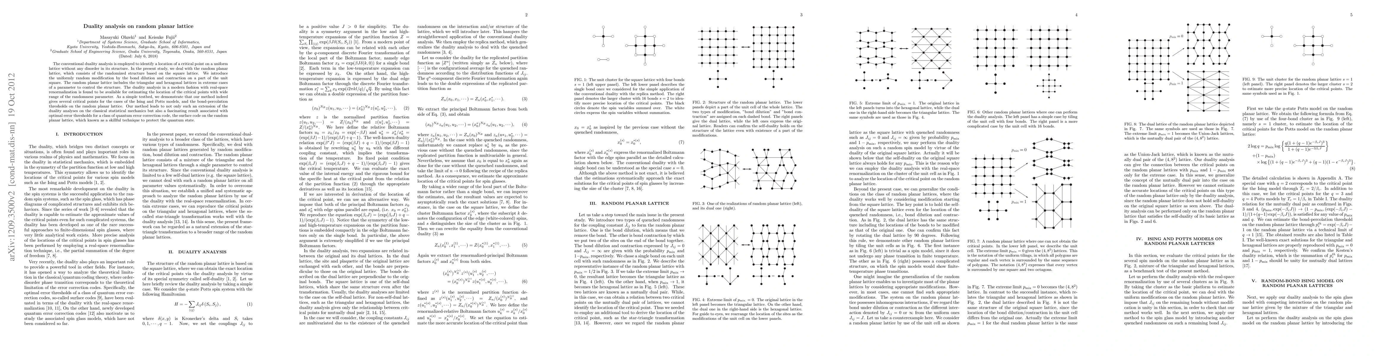 The conventional duality analysis is employed to identify a location of a critical point on a uniform lattice without any disorder in its structure. In the present study, we deal with the random planar lattice, which consists of the randomized structure based on the square lattice. We introduce the uniformly random modification by the bond dilution and contraction on a part of the unit square. The random planar lattice includes the triangular and hexagonal lattices in extreme cases of a parameter to control the structure. The duality analysis in a modern fashion with real-space renormalization is found to be available for estimating the location of the critical points with wide range of the randomness parameter. As a simple testbed, we demonstrate that our method indeed gives several critical points for the cases of the Ising and Potts models, and the bond-percolation thresholds on the random planar lattice. Our method leads to not only such an extension of the duality analyses on the classical statistical mechanics but also a fascinating result associated with optimal error thresholds for a class of quantum error correction code, the surface code on the random planar lattice, which known as a skillful technique to protect the quantum state.