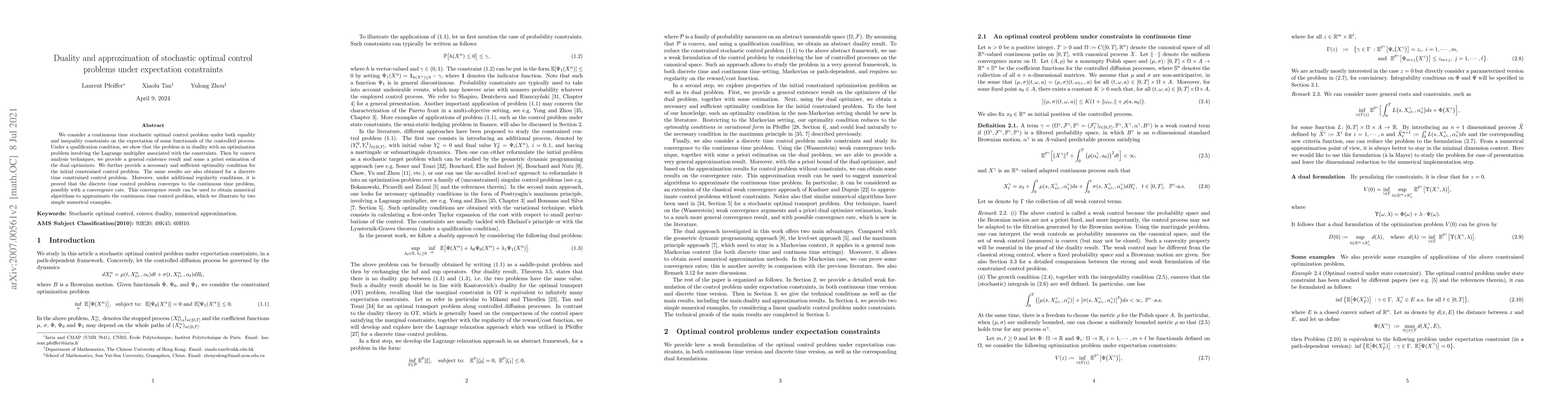 This paper explores continuous and discrete time stochastic optimal control problems with expectation constraints, establishing duality and approximation techniques. It provides existence results, optimality conditions, and a convergence theorem linking discrete and continuous models, along with numerical examples for practical application.