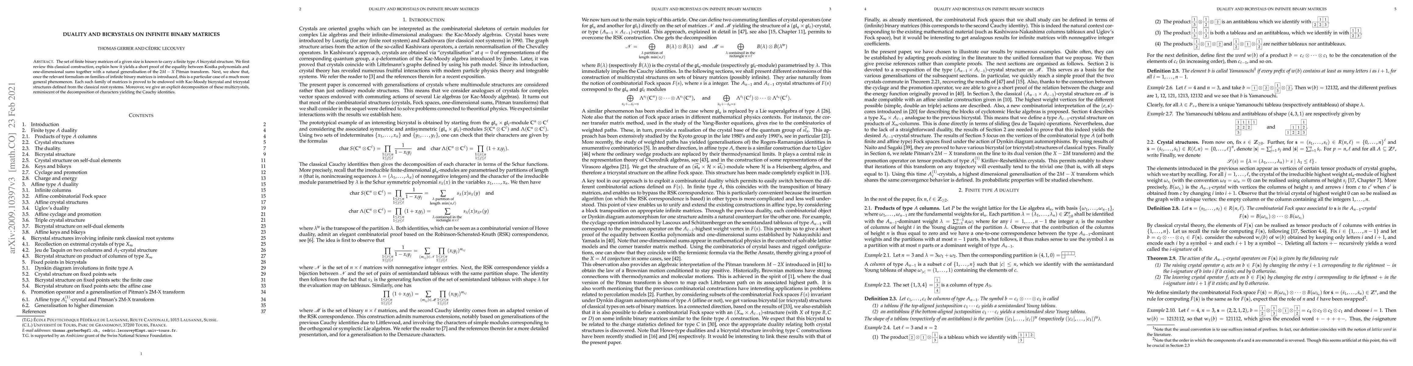 The set of finite binary matrices of a given size is known to carry a finite type A bicrystal structure. We first review this classical construction, explain how it yields a short proof of the equality between Kostka polynomials and one-dimensional sums together with a natural generalisation of the 2M -- X Pitman transform. Next, we show that, once the relevant formalism on families of infinite binary matrices is introduced, this is a particular case of a much more general phenomenon. Each such family of matrices is proved to be endowed with Kac-Moody bicrystal and tricrystal structures defined from the classical root systems. Moreover, we give an explicit decomposition of these multicrystals, reminiscent of the decomposition of characters yielding the Cauchy identities.