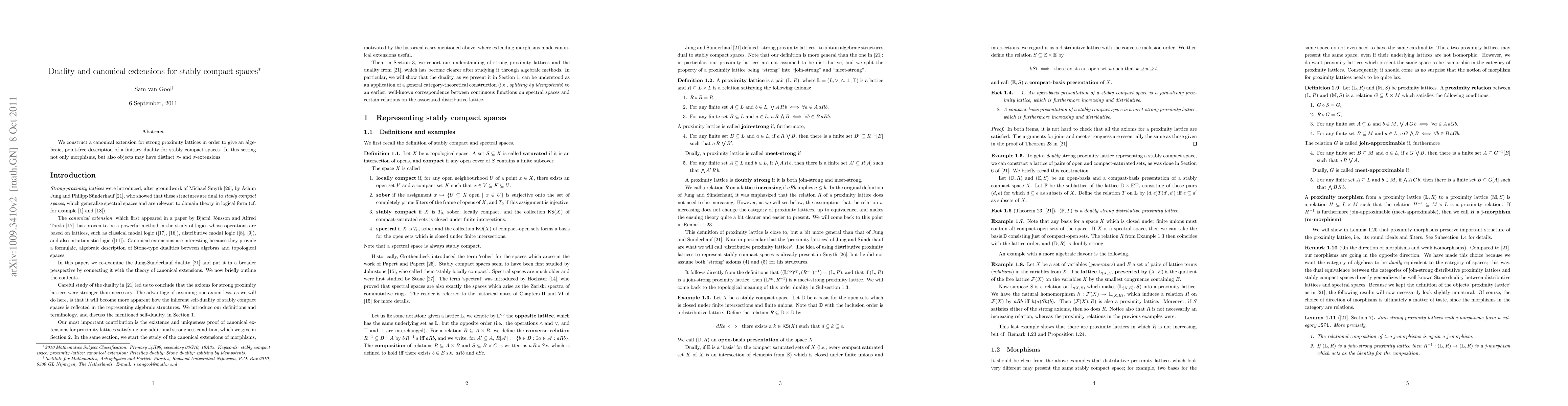 This paper constructs a canonical extension for strong proximity lattices to provide an algebraic, point-free duality for stably compact spaces, highlighting that both objects and morphisms can have distinct pi- and sigma-extensions in this framework.