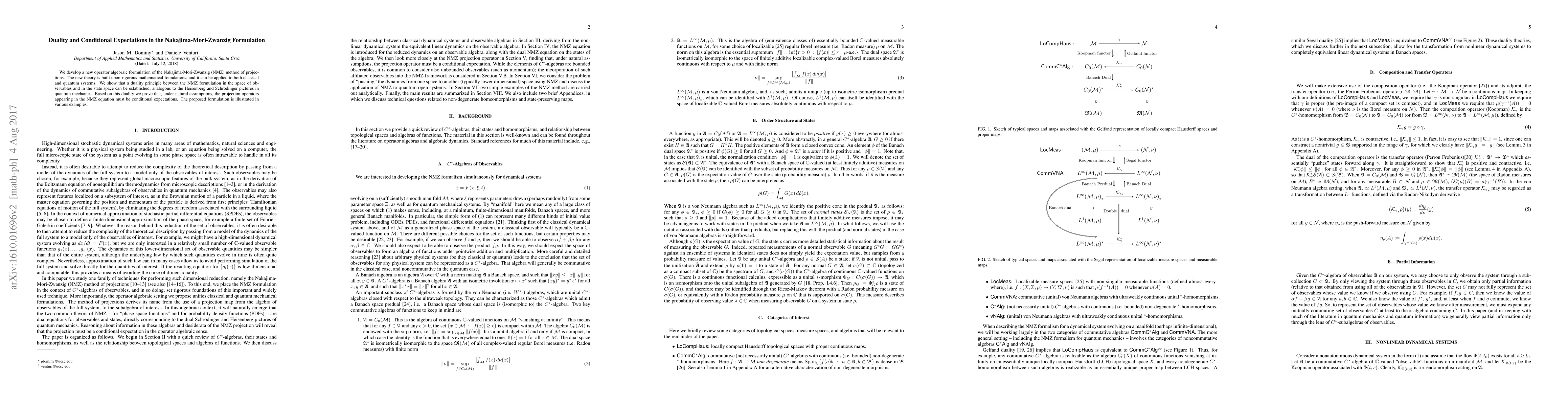 We develop a new operator algebraic formulation of the Nakajima-Mori-Zwanzig (NMZ) method of projections. The new theory is built upon rigorous mathematical foundations, and it can be applied to both classical and quantum systems. We show that a duality principle between the NMZ formulation in the space of observables and in the state space can be established, analogous to the Heisenberg and Schr\"odinger pictures in quantum mechanics. Based on this duality we prove that, under natural assumptions, the projection operators appearing in the NMZ equation must be conditional expectations. The proposed formulation is illustrated in various examples.