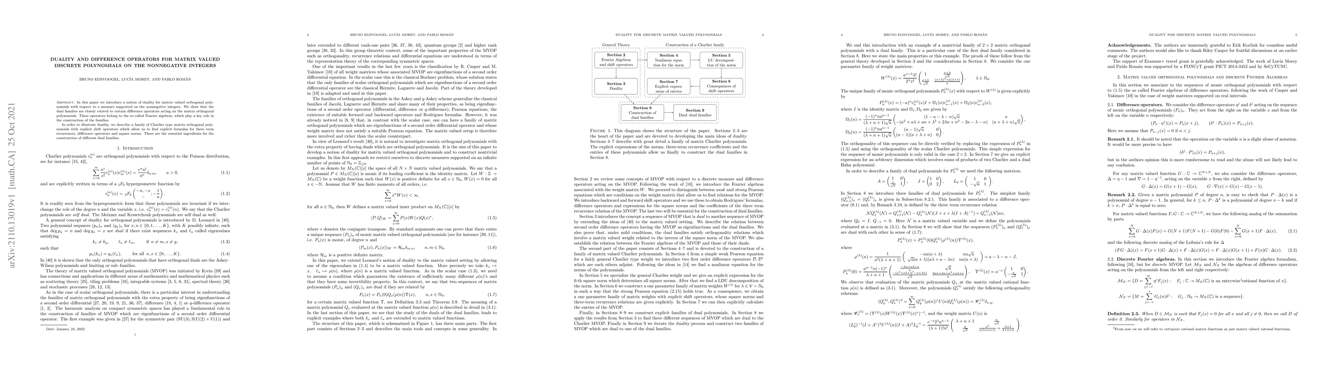 This paper introduces a duality concept for matrix valued orthogonal polynomials on nonnegative integers, linking dual families to specific difference operators within Fourier algebras. It also presents explicit shift operators for Charlier type matrix orthogonal polynomials to derive recurrences, difference operators, and norms for constructing dual families.