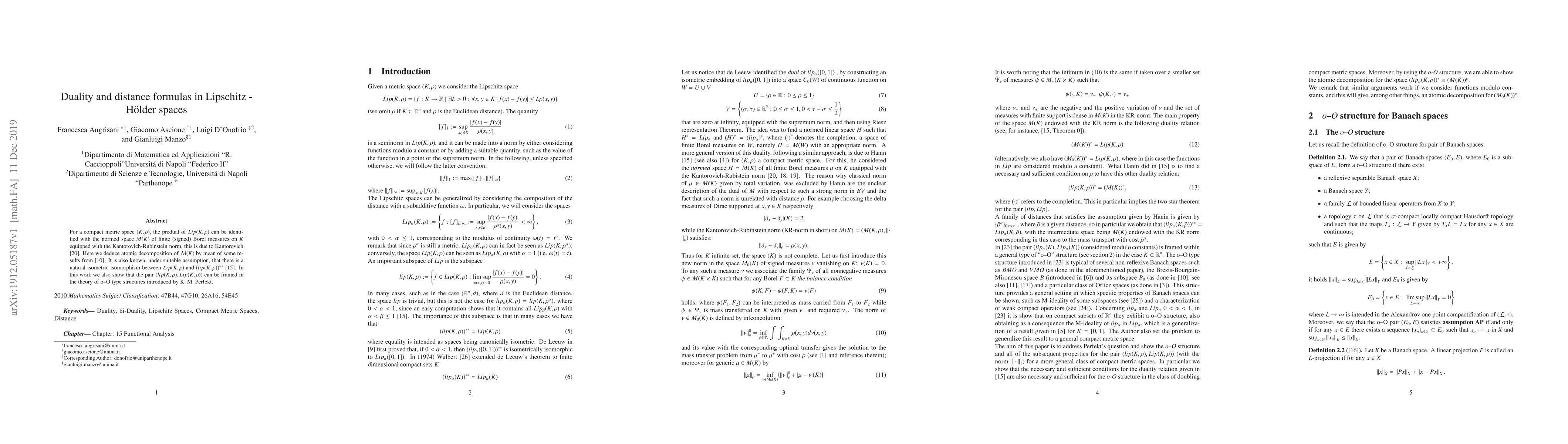 For a compact metric space $(K, \rho)$, the predual of $Lip(K, \rho)$ can be identified with the normed space $M(K)$ of finite (signed) Borel measures on $K$ equipped with the Kantorovich-Rubinstein norm, this is due to Kantorovich [20]. Here we deduce atomic decomposition of $M(K)$ by mean of some results from [10]. It is also known, under suitable assumption, that there is a natural isometric isomorphism between $Lip(K, \rho)$ and $(lip(K, \rho))_{**}$ [15]. In this work we also show that the pair $(lip(K, \rho), Lip(K, \rho))$ can be framed in the theory of o-O type structures introduced by K. M. Perfekt.