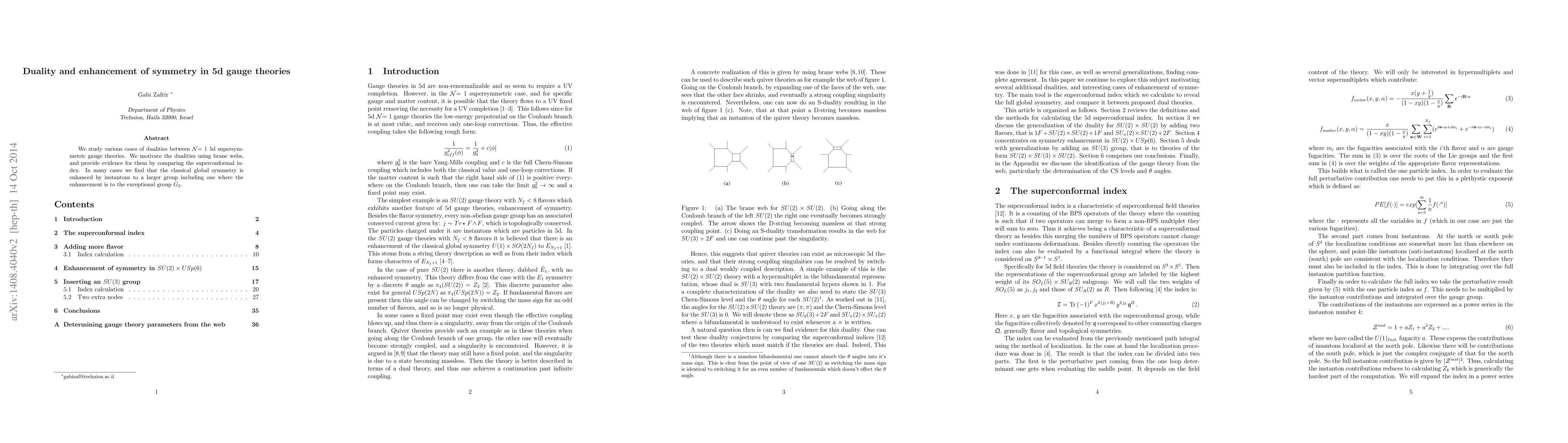 This paper investigates dualities between $\cal{N}=1$ 5d supersymmetric gauge theories, using brane webs to motivate these dualities and the superconformal index to provide evidence. It finds instances where classical global symmetries are enhanced by instantons, including to the exceptional group $G_2$.
