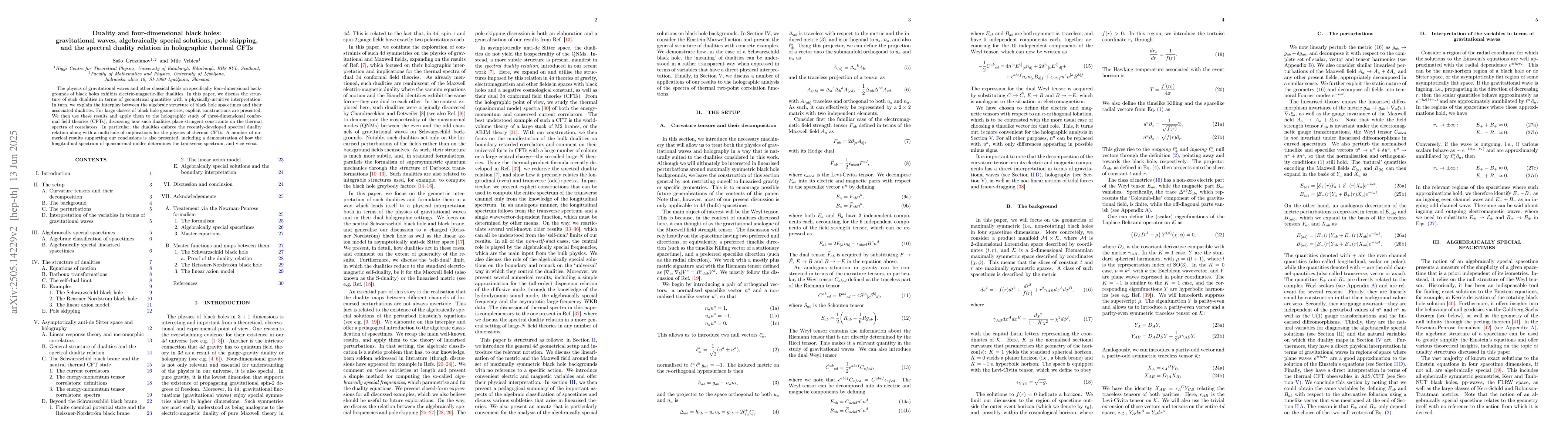The physics of gravitational waves and other classical fields on specifically four-dimensional backgrounds of black holes exhibits electric-magnetic-like dualities. In this paper, we discuss the structure of such dualities in terms of geometrical quantities with a physically-intuitive interpretation. In turn, we explain the interplay between the algebraic structure of black hole spacetimes and their associated dualities. For large classes of black hole geometries, explicit constructions are presented. We then use these results and apply them to the holographic study of three-dimensional conformal field theories (CFTs), discussing how such dualities place stringent constraints on the thermal spectra of correlators. In particular, the dualities enforce the recently-developed spectral duality relation along with a multitude of implications for the physics of thermal CFTs. A number of numerical results supporting our conclusions is also presented, including a demonstration of how the longitudinal spectrum of quasinormal modes determines the transverse spectrum, and vice versa.