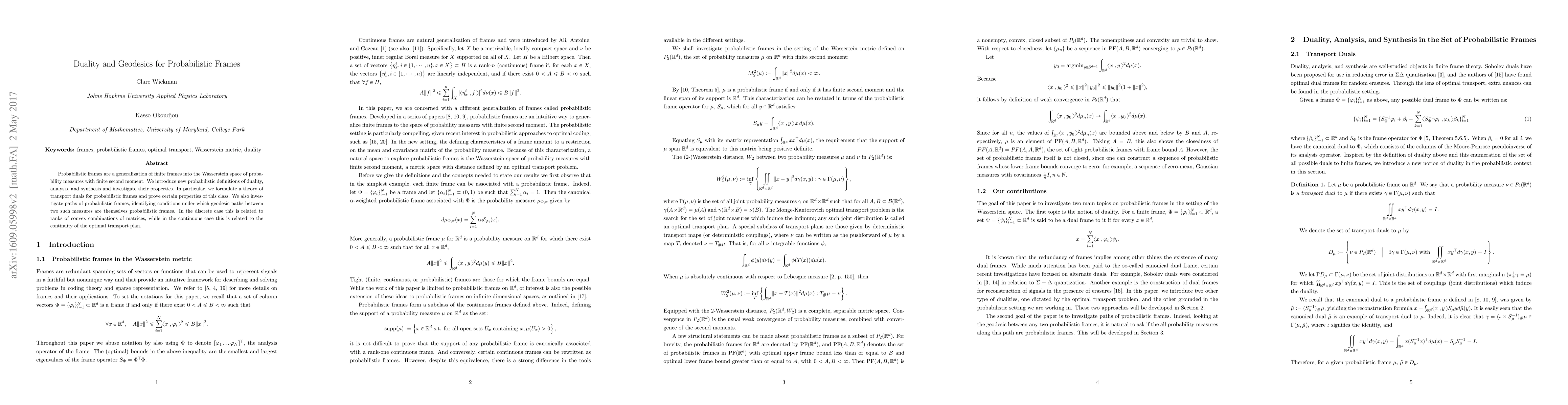 This paper generalizes the concept of frames to probabilistic frames in the Wasserstein space, introducing new definitions of duality and exploring their properties. It also investigates geodesic paths between probabilistic frames, establishing conditions under which these paths remain probabilistic frames, linking discrete matrix ranks and continuous optimal transport plans.