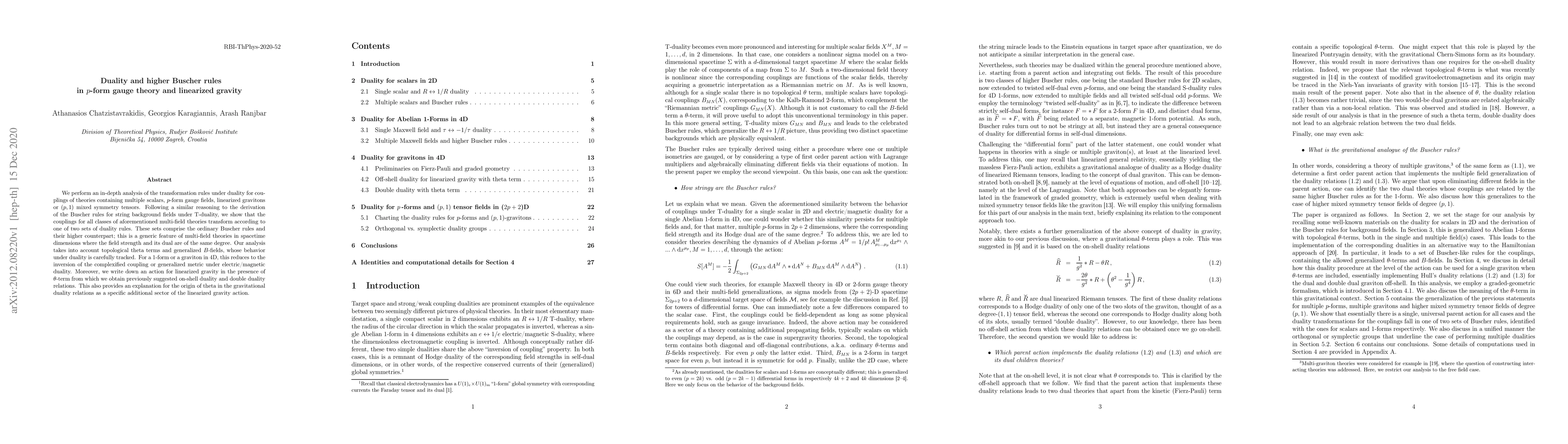This paper investigates the transformation rules under duality for theories involving multiple scalars, $p$-form gauge fields, and linearized gravitons, revealing two sets of Buscher rules. It also explains the origin of theta terms in gravitational duality relations through the inclusion of a $\theta$-term in the linearized gravity action.