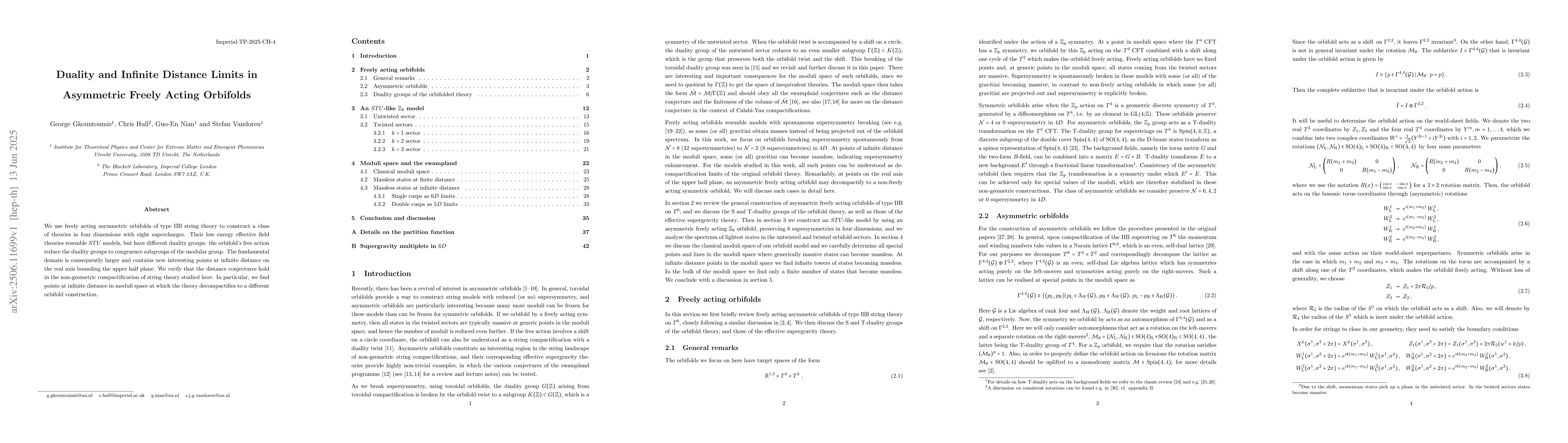 We use freely acting asymmetric orbifolds of type IIB string theory to construct a class of theories in four dimensions with eight supercharges. Their low energy effective field theories resemble $STU$ models, but have different duality groups: the orbifold's free action reduce the duality groups to congruence subgroups of the modular group. The fundamental domain is consequently larger and contains new interesting points at infinite distance on the real axis bounding the upper half plane. We verify that the distance conjectures hold in the non-geometric compactification of string theory studied here. In particular, we find points at infinite distance in moduli space at which the theory decompactifies to a different orbifold construction.