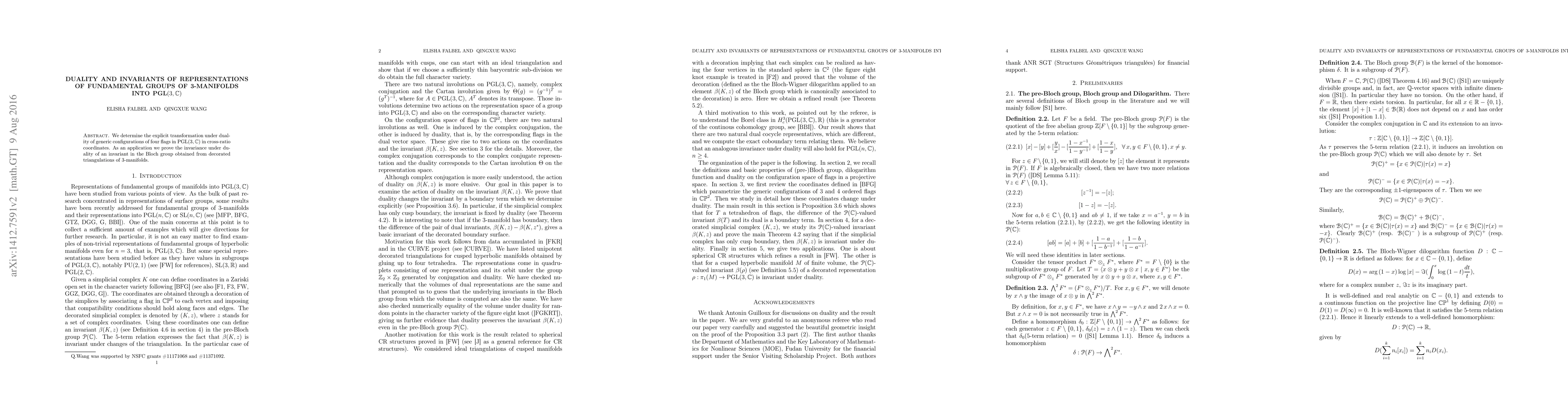 This paper determines the transformation under duality of four flags in $\PGL(3,\bC)$ and proves the invariance under duality of an invariant in the Bloch group derived from decorated triangulations of 3-manifolds.