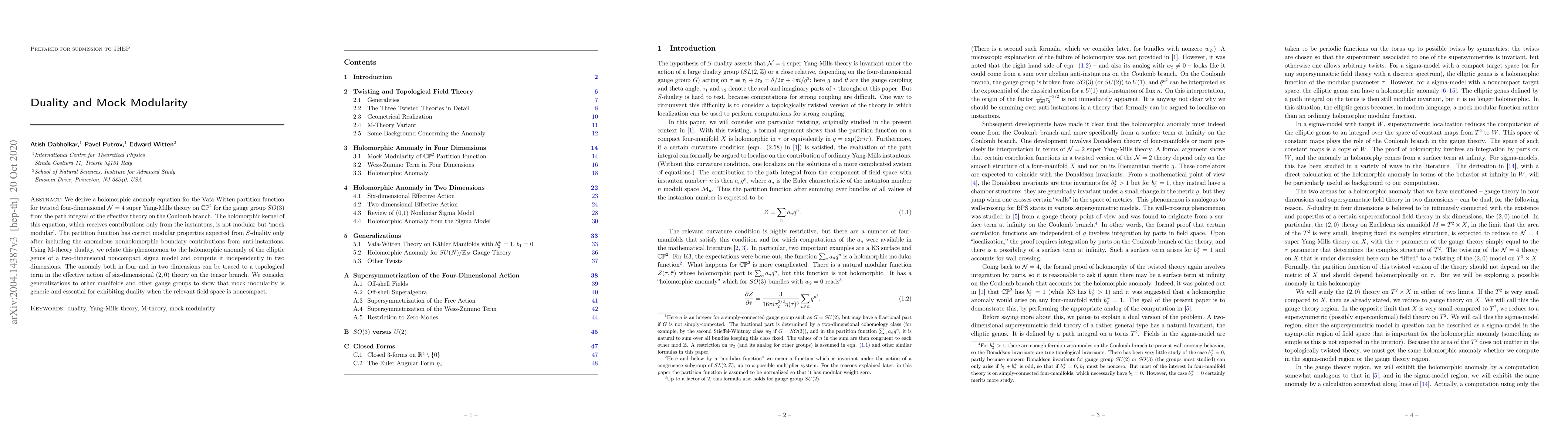 This paper derives a holomorphic anomaly equation for the Vafa-Witten partition function in four-dimensional $\mathcal{N} =4$ super Yang-Mills theory, revealing that the holomorphic kernel is mock modular, not modular. It connects this anomaly to the elliptic genus in two dimensions via M-theory duality, showing that mock modularity is essential for duality in noncompact field spaces.