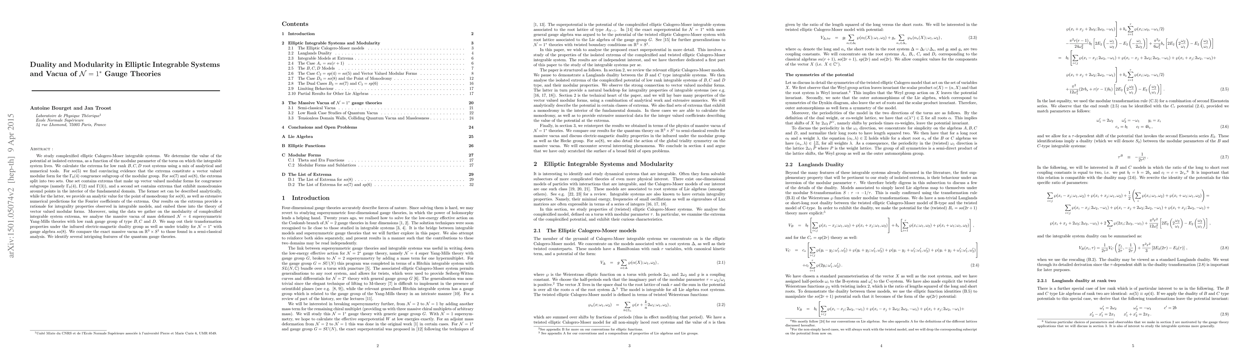We study complexified elliptic Calogero-Moser integrable systems. We determine the value of the potential at isolated extrema, as a function of the modular parameter of the torus on which the integrable system lives. We calculate the extrema for low rank B,C,D root systems using a mix of analytical and numerical tools. For so(5) we find convincing evidence that the extrema constitute a vector valued modular form for a congruence subgroup of the modular group. For so(7) and so(8), the extrema split into two sets. One set contains extrema that make up vector valued modular forms for congruence subgroups, and a second set contains extrema that exhibit monodromies around points in the interior of the fundamental domain. The former set can be described analytically, while for the latter, we provide an analytic value for the point of monodromy for so(8), as well as extensive numerical predictions for the Fourier coefficients of the extrema. Our results on the extrema provide a rationale for integrality properties observed in integrable models, and embed these into the theory of vector valued modular forms. Moreover, using the data we gather on the modularity of complexified integrable system extrema, we analyse the massive vacua of mass deformed N=4 supersymmetric Yang-Mills theories with low rank gauge group of type B,C and D. We map out their transformation properties under the infrared electric-magnetic duality group as well as under triality for N=1* with gauge algebra so(8). We find several intriguing properties of the quantum gauge theories.